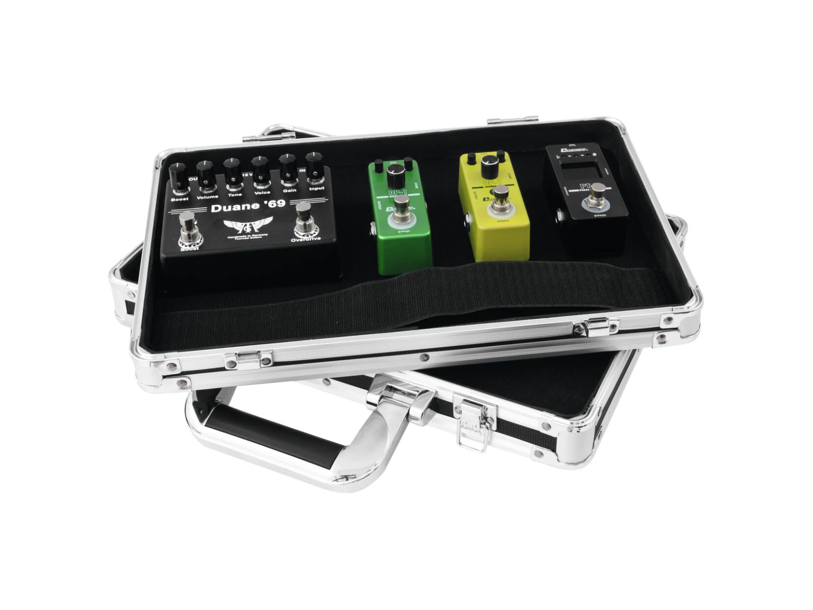 - Stable aluminum suitcase for up to 3 guitar effect pedals