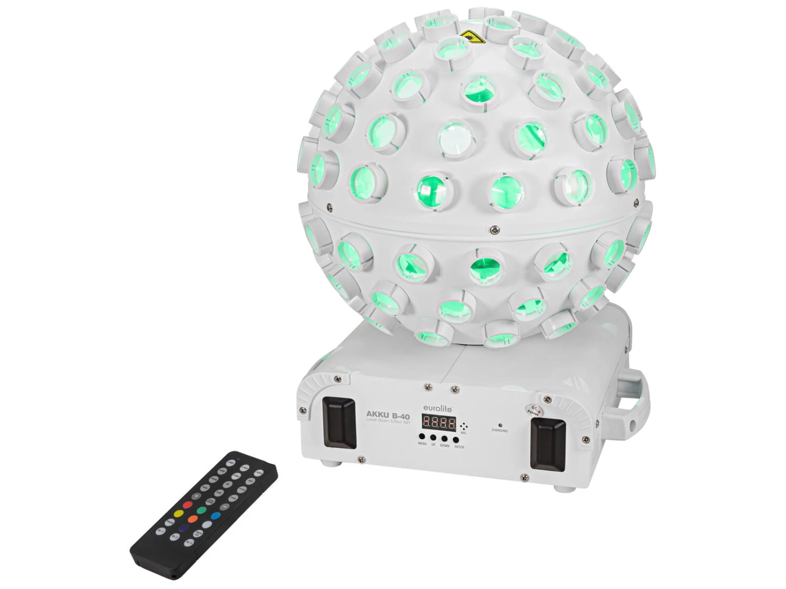 Battery-powered LED beam effect with RGBW colors, RG laser, AirW wireless system (2.4 GHz) and RF remote control