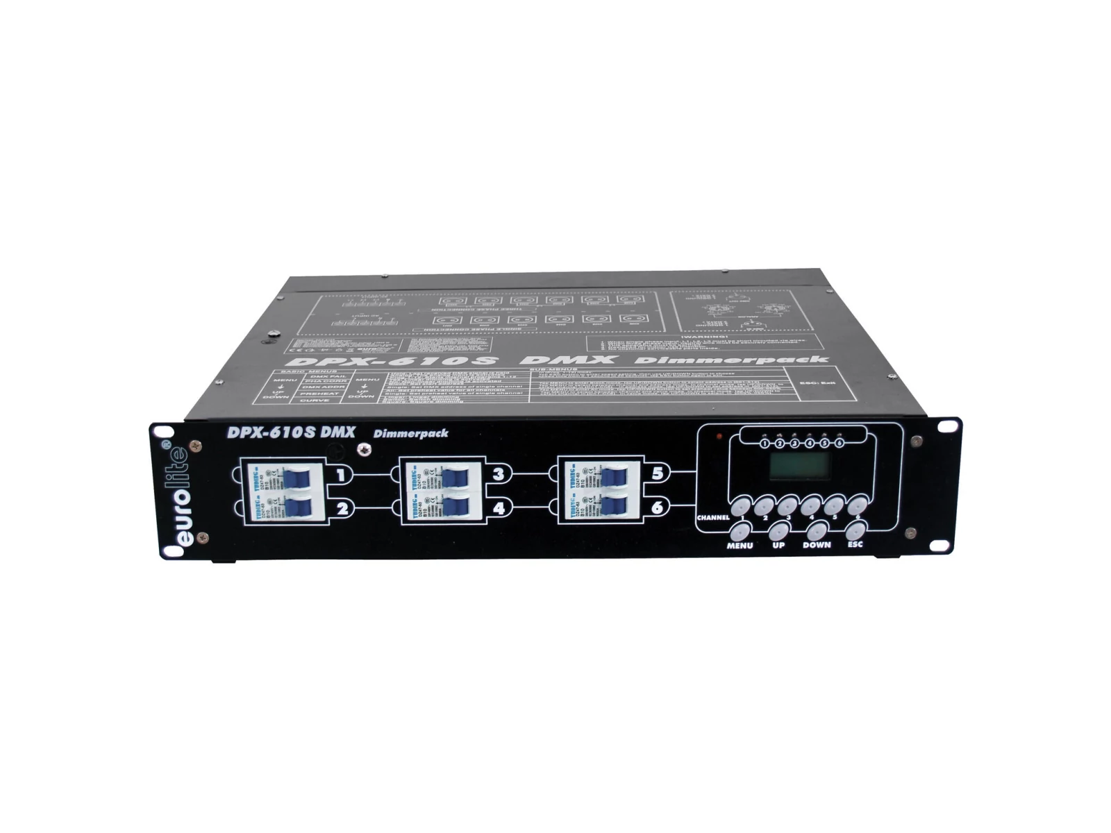 You can dim if you want - Eurolite dimmer pack for professional usersWith the DPX-610 S DMX Dimmer Pack by Eurolite you get a digital 6-channel dimmer pack for professional use. Eurolite dimmer packs have been an established part of many stages and events since the early 90's. DMX or analogue The device can be controlled analogously or via DMX. The DMX starting address can be set directly on the device. The DPX-610 S can be operated in single-phase or three-phase mode.Synchronizing multiple devicesYou can synchronize multiple devices via DMX. The built-in display and the LED indicators give you a good overview over the different modes.Setting the lamp pre-heatingThe lamp pre-heating can be set individually and directly on the device. One circuit-breaker per channel protects the device from overcurrent.The channel outputs on the rear panel are designed as safety plugs.