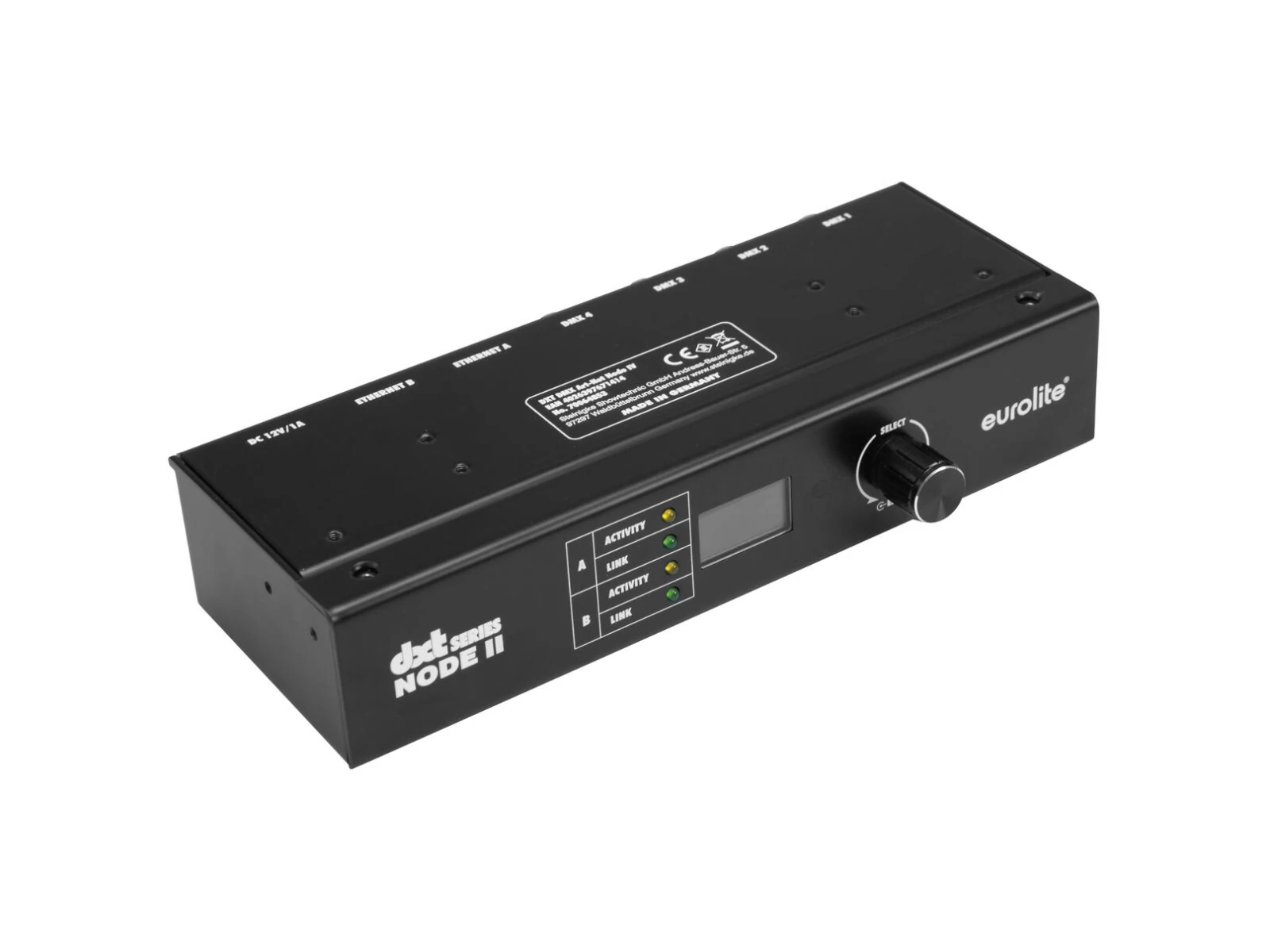 The DXT DMX Pixel Art-Net Node II is part of Eurolite's DXT series, which consists of high-performance and reliable DMX tools made in Germany. The Node II features two channels that can output either up to 512 DMX channels each or control up to 512 digital LED pixel channels. It provides two Neutrik XLR and 2 etherCON connectors, as well as two 4-pin removable terminals. The second etherCON connector enables daisy-chaining of the network connection with multiple devices. The device can be configured with an integrated OLED display, via Art-Net or with a website.