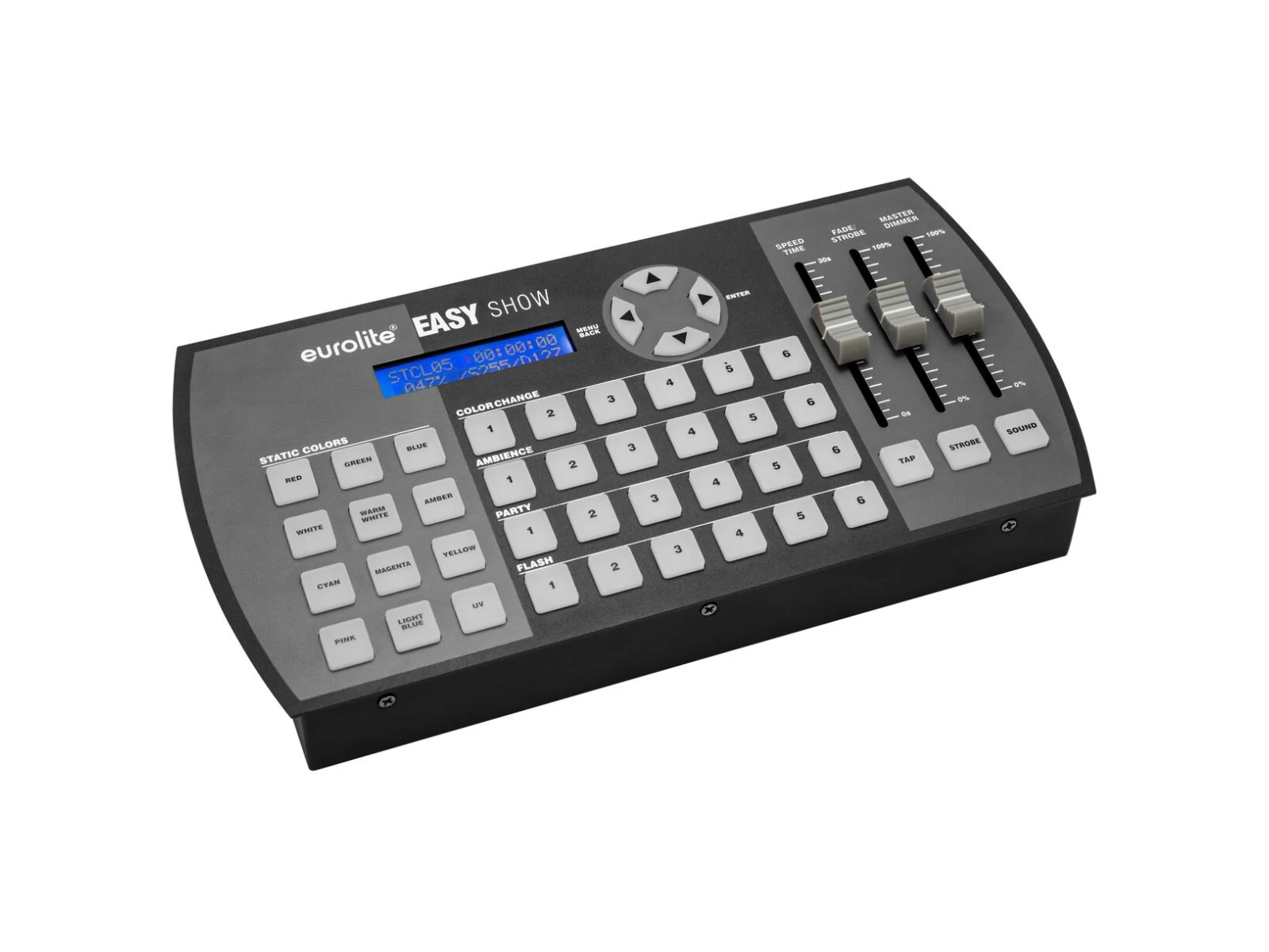- Preprogrammed 24 scenes/chases and 12 cues