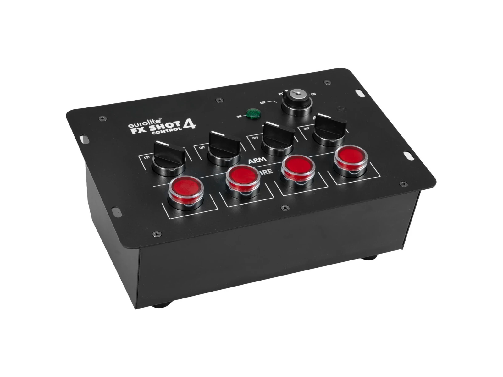 The 4-channel control system FX SHOT 4 is ideal for triggering a wide range of special effects devices, including confetti and streamer launchers and CO2 effects. The device has a key switch with status indicator and red trigger switches. Additional safety switches in the channels prevent accidental triggering. The FX SHOT 4 provides P-Con terminals for all connections.