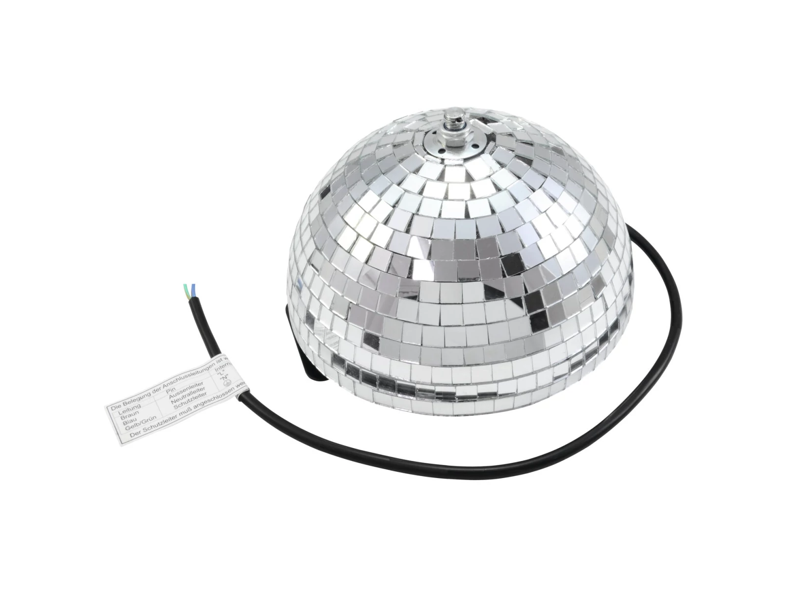 The classic light effect of the 70s and 80sNo party without a disco ball! Its simple design and affordable price make the disco ball a popular decoration classic used to create fascinating plays of light on the dance floor. For locations with limited space, this half mirror ball is a good alternative to the classic disco ball which is even easier to handle and fasten.This model in professional quality has a diameter of 20 cm, is covered with countless small mirrors and is delivered with power cord and safety plug. The integrated motor rotates the ball evenly and slowly at 2.5 rotations per minute and is particularly economical with a consumption of only 3.5 watts. This makes the ball ideal for decorations in clubs, bars, dance schools, shop windows and party rooms of any kind!