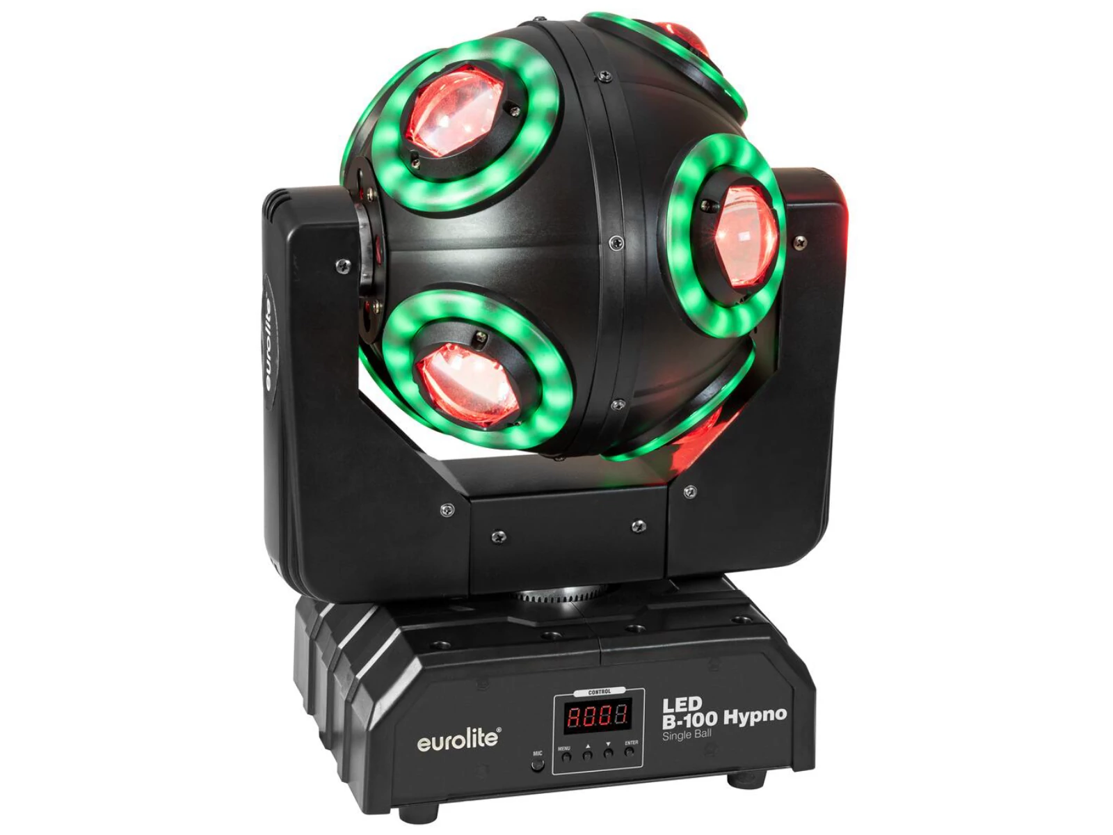 LED beam effect with RGBW color mixing and 8 RGB hypno rings