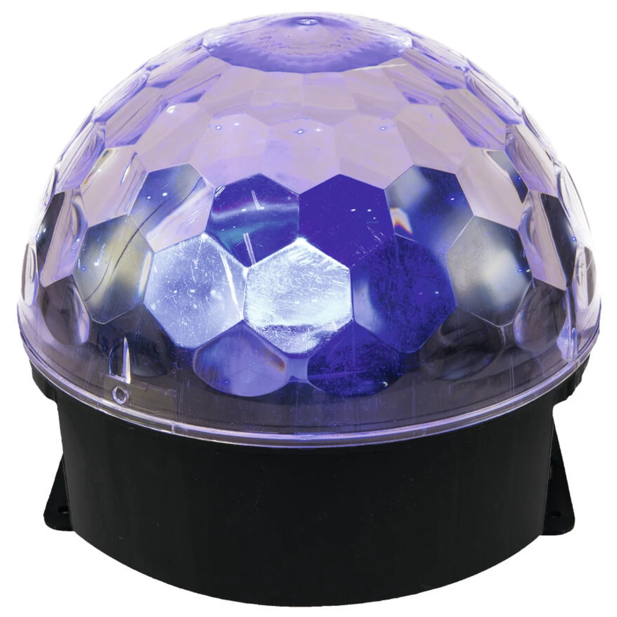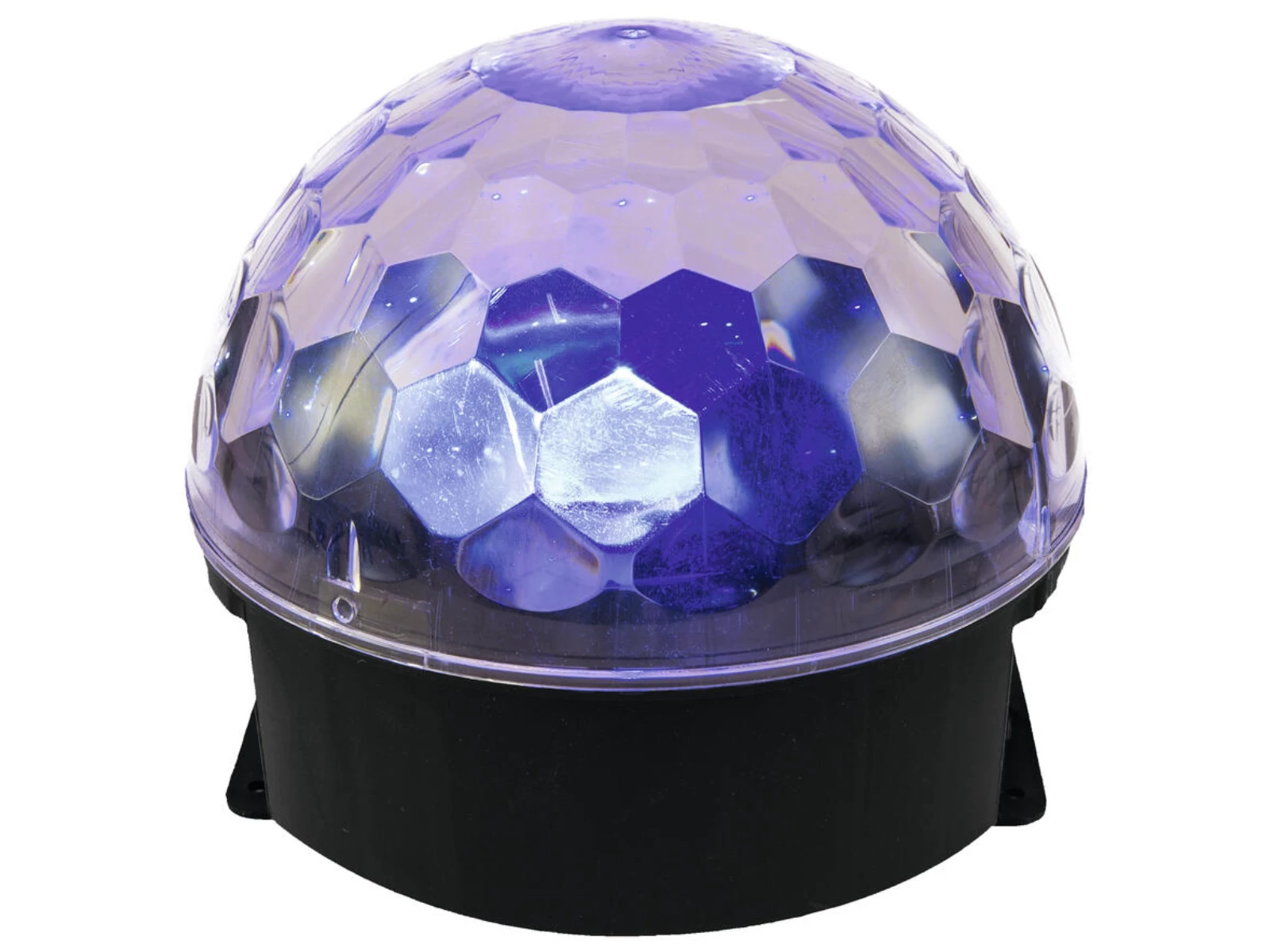 The compact LED BC-4 Beam Effect by Eurolite produces impressive, room-filling mirror ball effects in living rooms, home party rooms, smaller clubs and more - fully automatically thanks to the easy-to-handle plug & play operation.The clear and faceted surface atmospherically swirls the beams through the room. The LED BC-4 comes equipped with six bright LEDs in the colors red, orange, blue, white, green and purple. Thanks its ultralight plastic enclosure, you can easily take this effect with you and set it up everywhere. The base plate also allows for wall mounting.