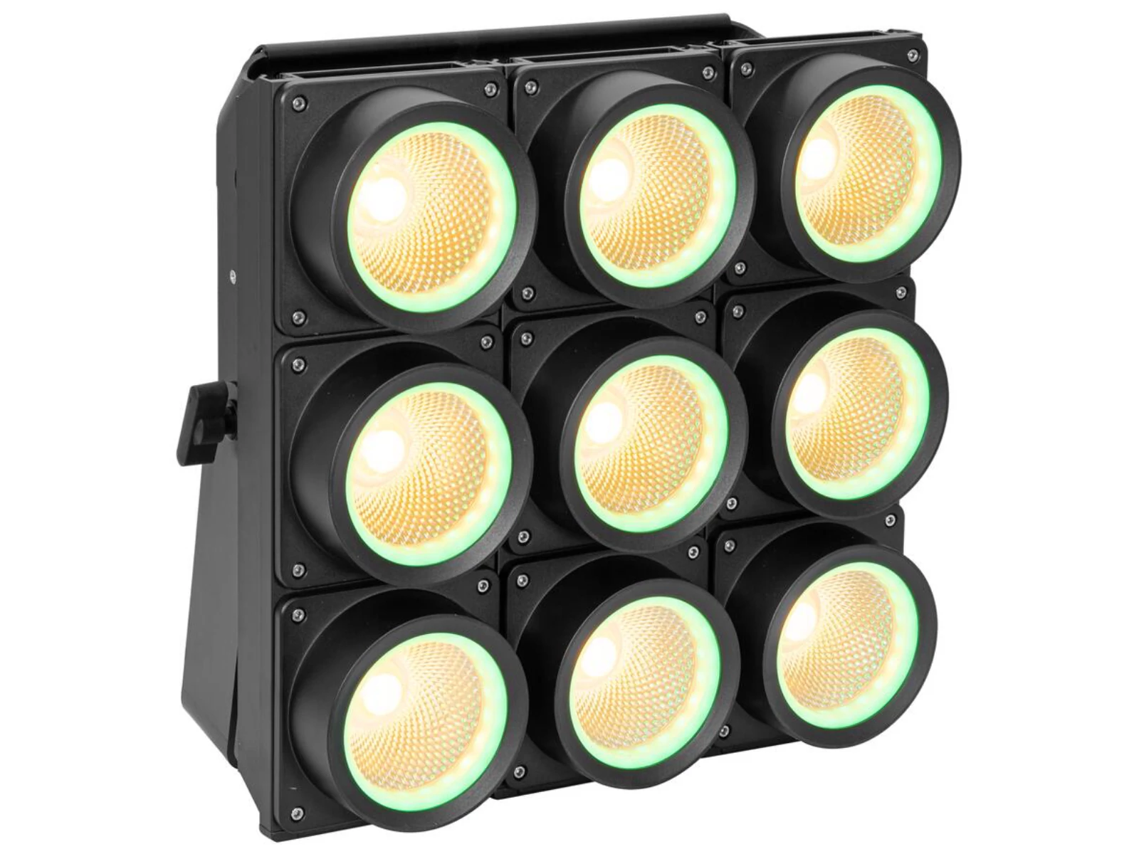 - Each of the 9 COB blinder LEDs is surrounded by 2 RGB segments for atmospheric light