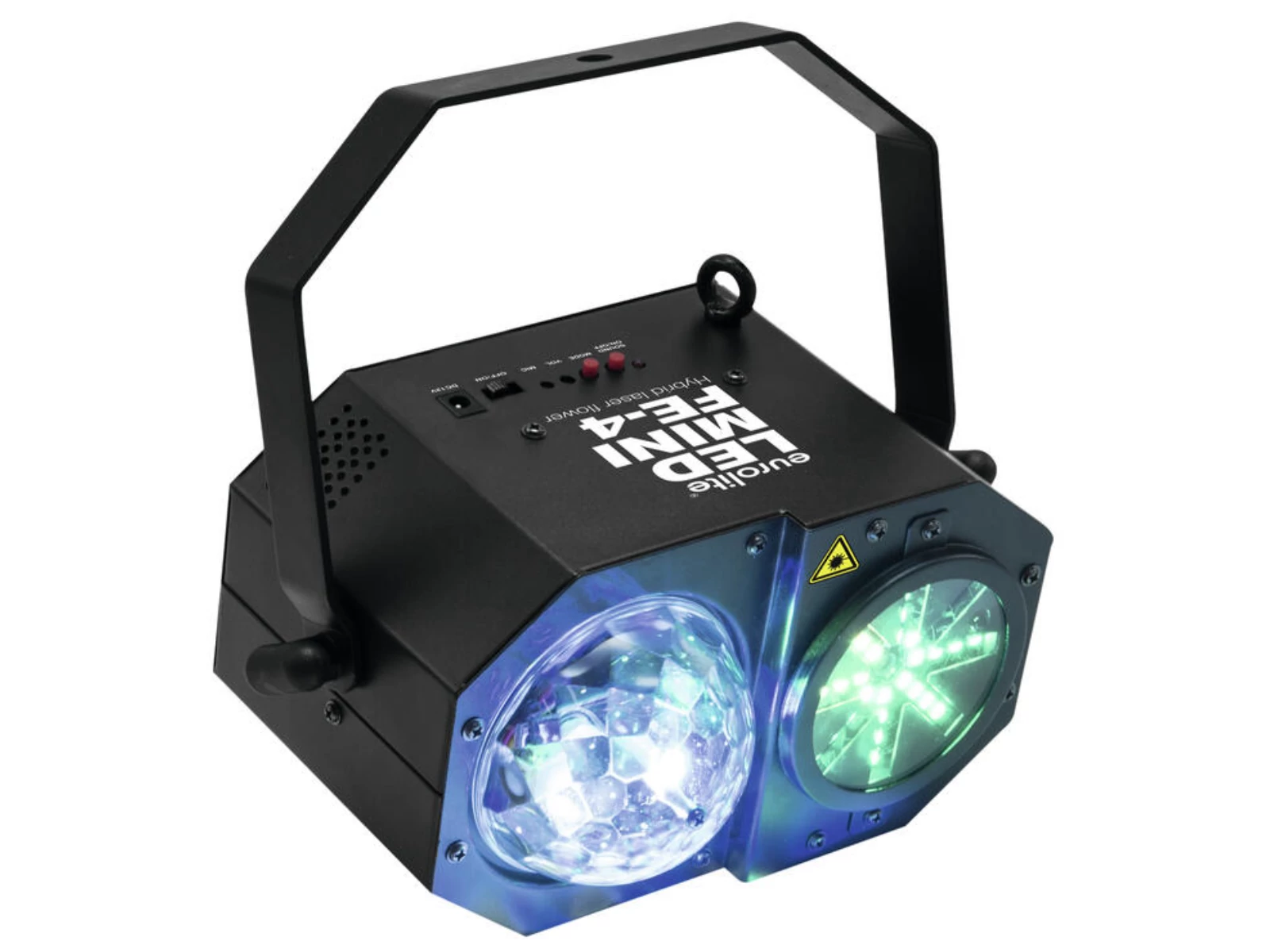 With this party light by Eurolite you can illuminate small and medium-sized rooms in three different colors plus white - and cover the room in fancy wash and strobe effects.A rotating mirror ball with four LEDs swirls brilliant RGBW colors through the room while an extra 32 LEDs make for strobe effects, chases and more. Tiny light dots from two laser diodes make a great contrast to this sea of colors. For control you can either rely on the four preset programs or you use the supplied IR remote control to make adjustments.The Eurolite Hybrid Laserflower is equipped with a microphone adjusting the effects to the rhythm of the music if you choose the sound-controlled mode - without any further adjustments on your part. All necessary plugs and cords are included and the mounting bracket allows for installation at any location you choose. The Mini FE-4 is an all-rounder for every occasion, be it slow wedding dances or a lavish party.