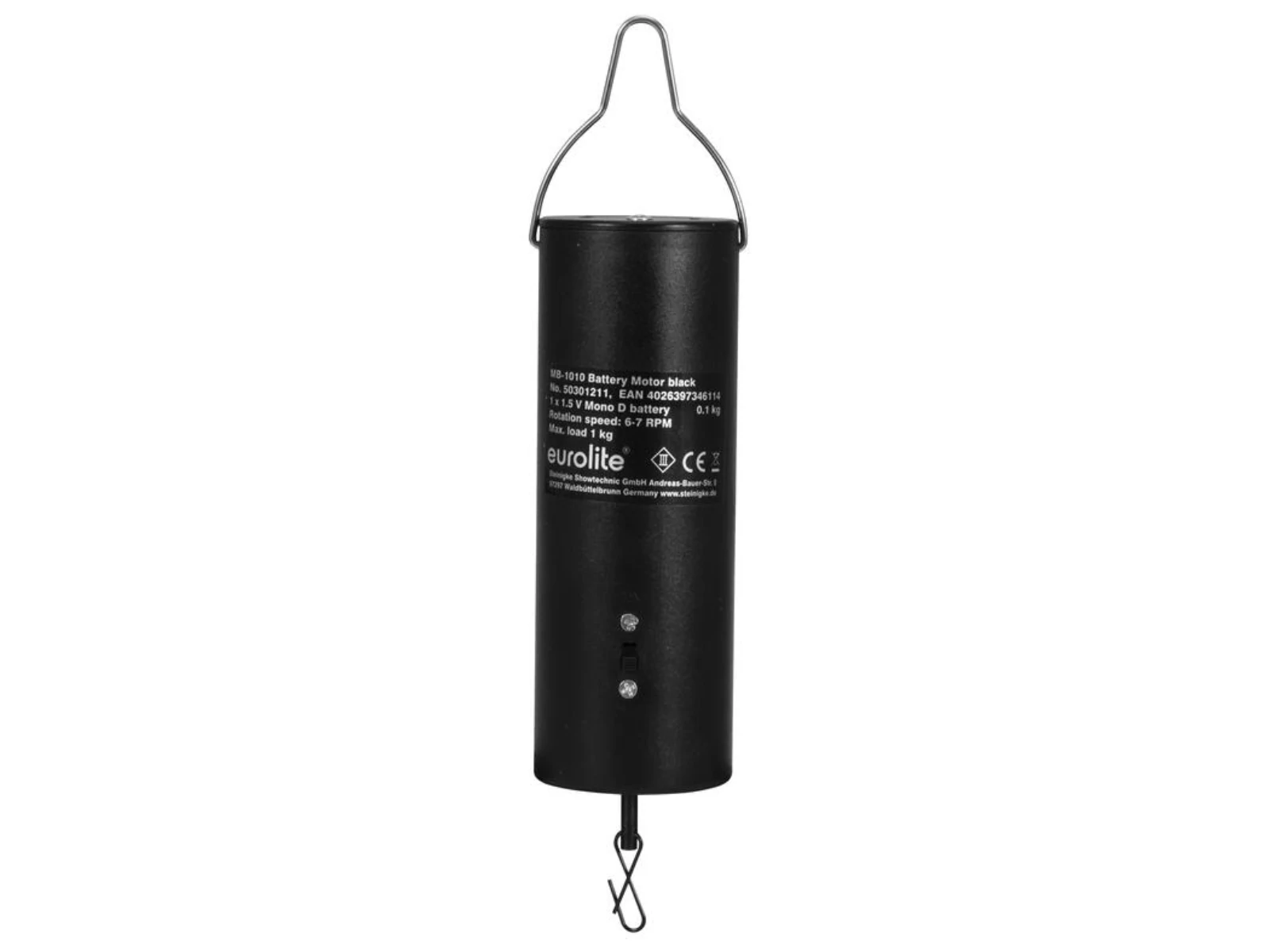 With this battery-operated Eurolite motor you can now let mirror balls rotate in rooms without power sockets too. The motor requires a 1.5 V battery, type Mono D, and can carry a load of up to 1 kg. This equals a mirror ball of approximately 20 cm, safety margin included. The motor also possesses an on/off switch and convenient eyelets for mounting. It works very quietly and rotates the ball steadily slowly with 6-7 rotations per minute.This product is available in the colors black and white.
