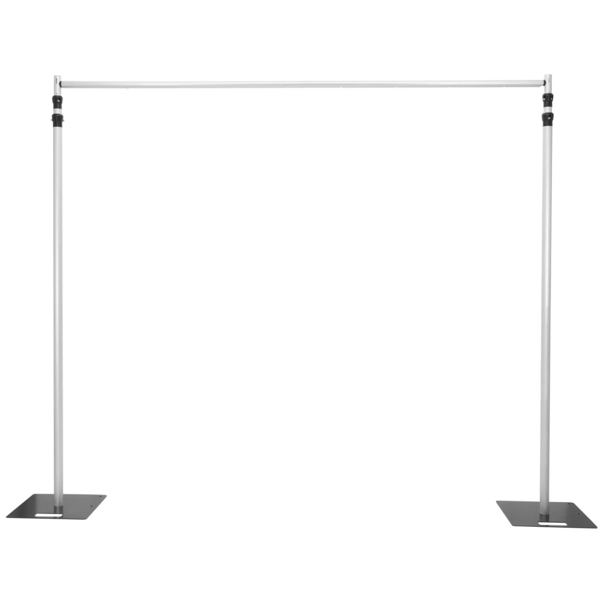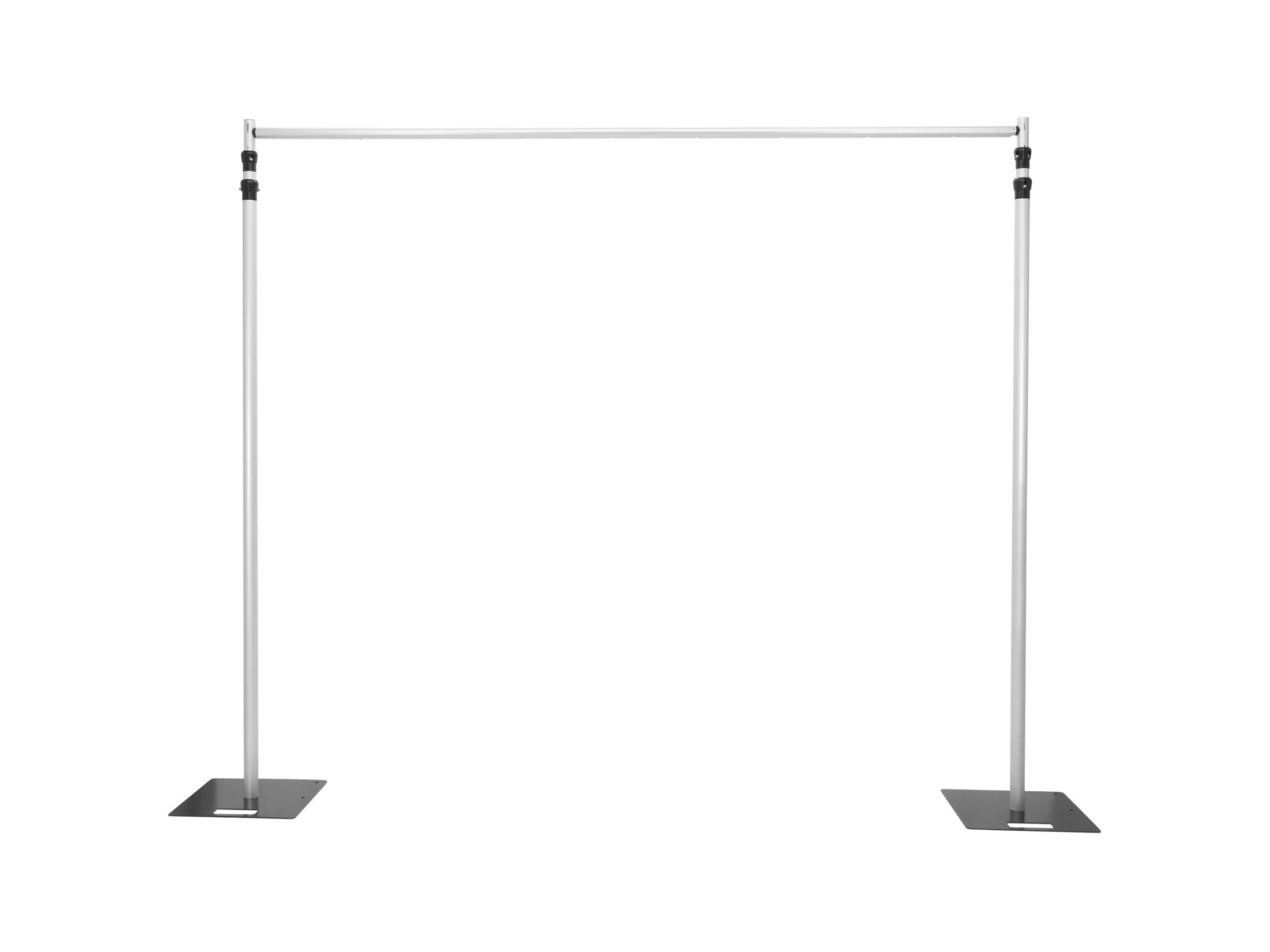 - The vertical bars are simply put onto the base plates. Then lock in the telescopic crossbar and attach hush cloth to it with tethers and the stage background is set up.