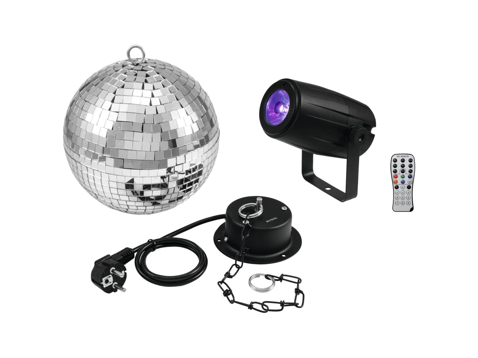 - 1 x spotlight, 1 x mirror ball, 1 x user manual, 1 x motor, 1 x remote control, 1 x battery, 3 x screw, 1 x chain