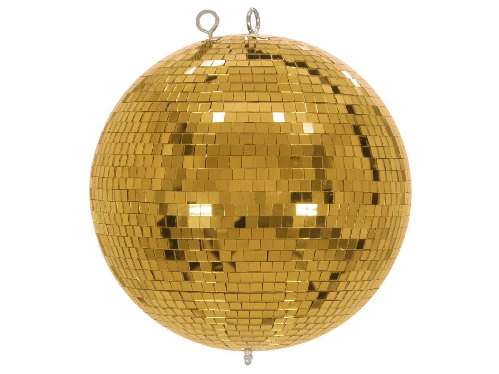 No party without a disco ball! Its simple design and affordable price make the disco ball a popular decoration classic used to create fascinating plays of light on the dance floor. Eurolite offers a wide range of disco balls in different colors and sizes.This model in professional quality has a diameter of 30 cm and is covered with countless small gold-colored mirrors (10 x 10 mm). The robust plastic core is covered with hundreds of small mirror facets and features a continuous shaft guaranteeing a high tensile strength. The mirror ball also includes two eyelets allowing for attaching both the fastening chain and the required fall protection. An additional motor can be used optionally to make the mirror ball rotate automatically. Suitable motors, the required mounting material and a transport case are available as accessories.