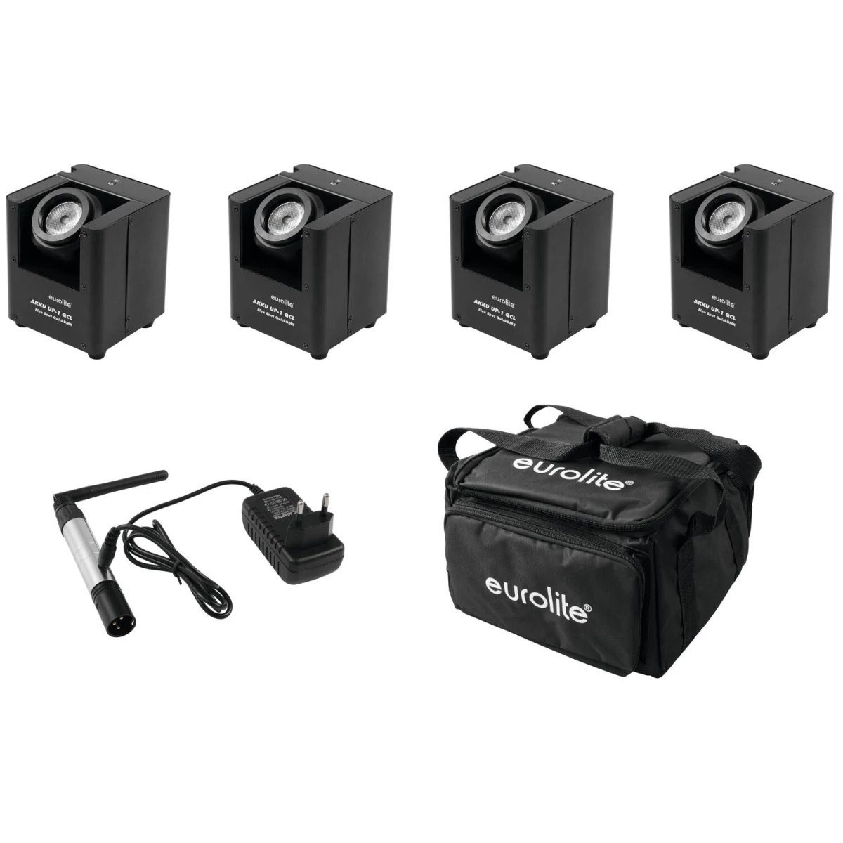 4x LED uplight with black soft bag and wireless DMX transmitter