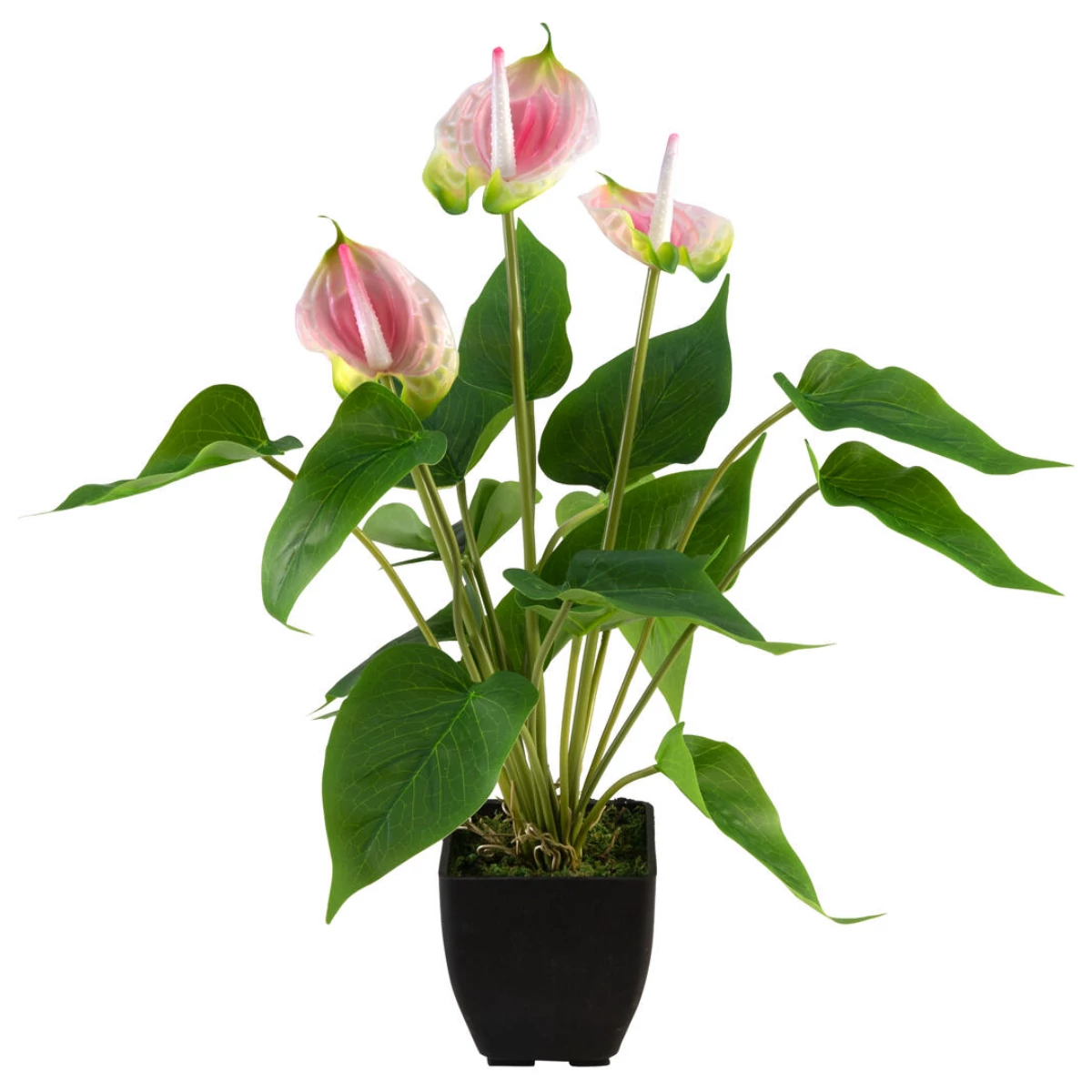This long flowering houseplant, whose botanical name is "Anthurium andreanum", is also known as flamingo flower. With simple elegance, it convinces as an ideal table and counter decoration for your office and living rooms, as well as for restaurants and hotels.The actual blossom (bulb) of the anthurium is located in the middle of tall leaves in white and pink, which have heart-shaped protrusions. These tower above the green leafy stand of the artificial plant and convince the viewer as a blooming eye-catcher. The decorative foliage is made of waterproof tarpaulin and shows the typical leaf embossing of the real plants. Aerial roots form the end of the plant towards the moss cover of the pot.The flamingo flower is delivered in a plain decorative pot. Accordingly, it can be easily placed in your premises with a few simple steps and without much effort.