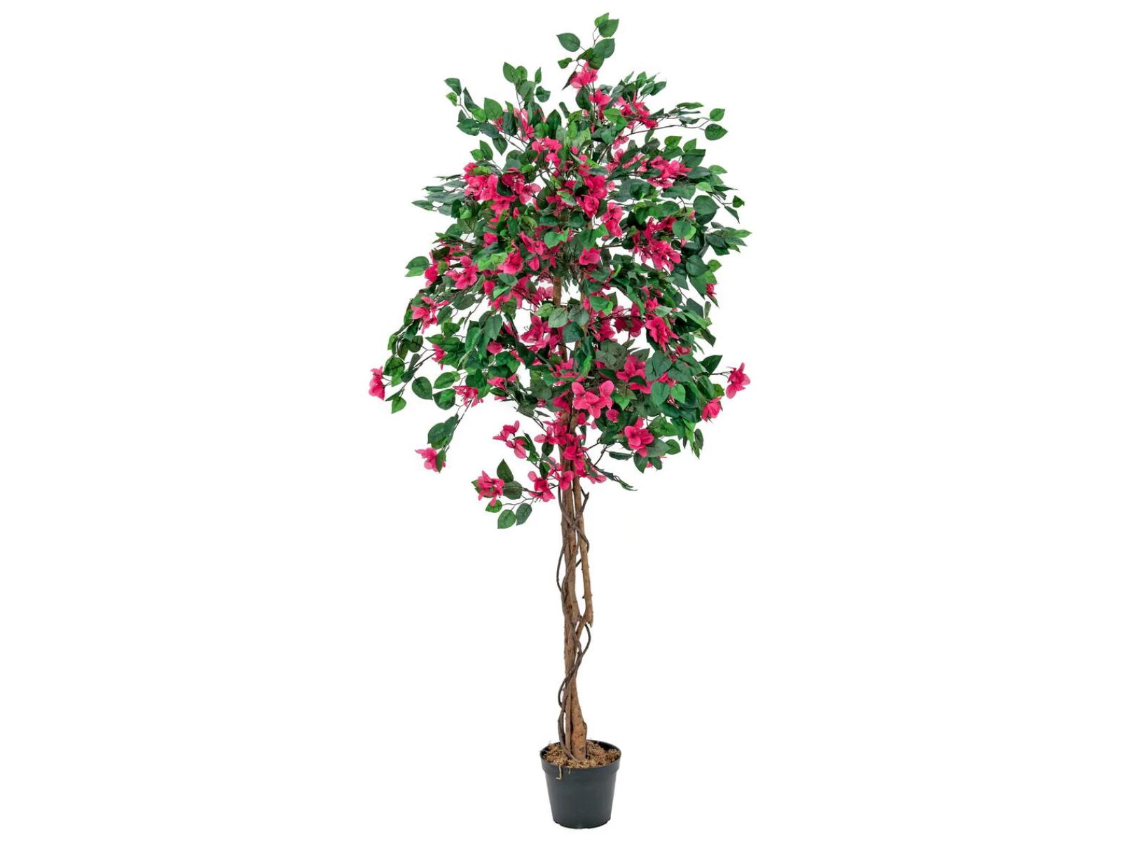 Originally, the real bougainvillea - also called triple flower - comes from South America. In southern countries, we find the beautiful, brightly colored climbing plant mainly in gardens and as a wall covering.Get this flowering eye-catcher in the form of a beautiful artificial tree in your premises with Europalms.With a total height of about 150 cm, the bougainvillea can not be overlooked and is the ideal decorative element for your celebrations. A beautiful contrast to the lush green of the tapered foliage is the intense color of the upper leaves, in the middle of which sit the actual flowers. The high trunk is formed by 3 natural trunks on which lianas climb.Unlike its natural model, the artificial bougainvillea has no thorns.Included in the delivery is a basic garden pot, which gives the plant a stable stand when placed in a planter.