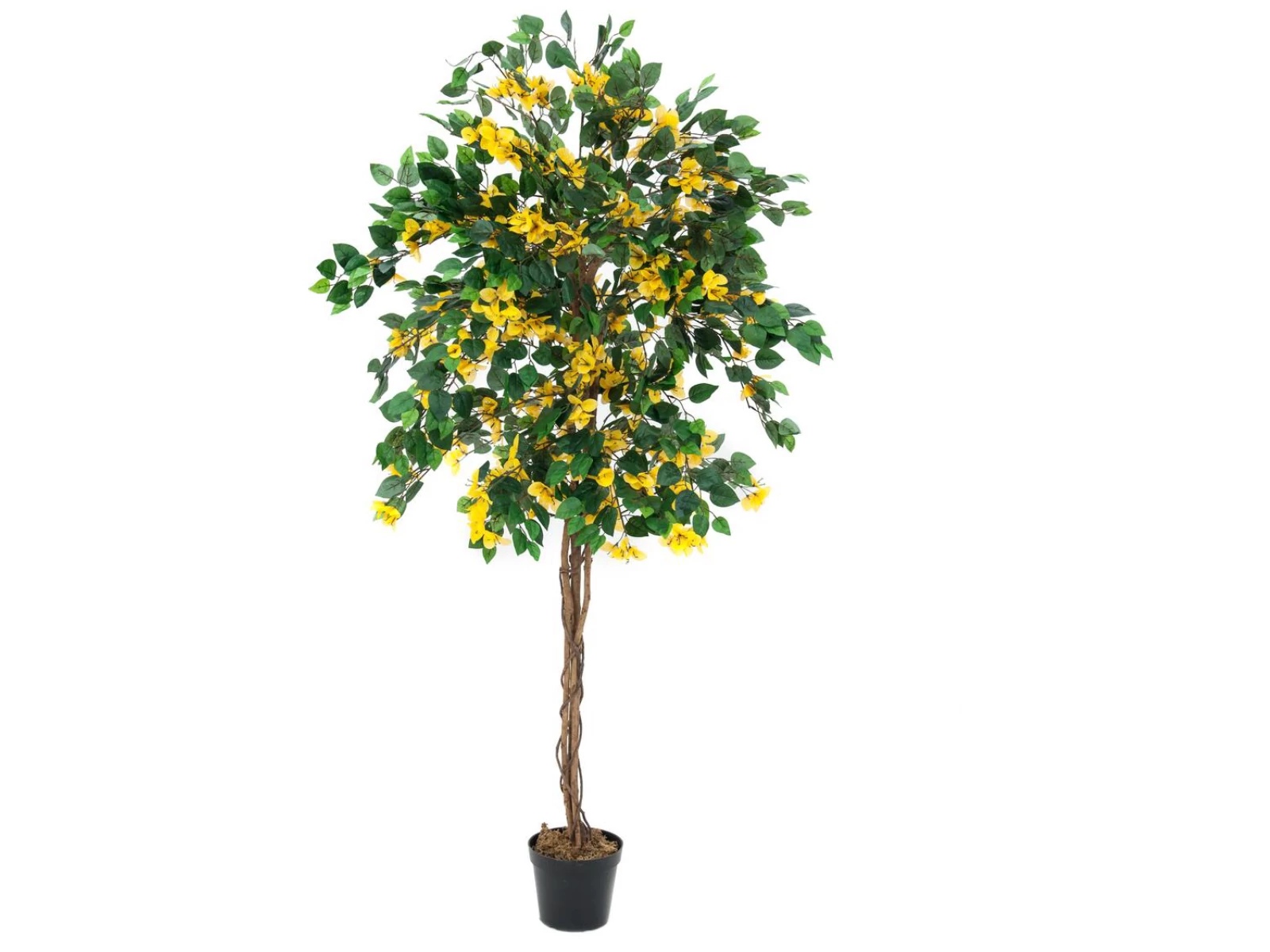 Originally, the real bougainvillea - also called triple flower - comes from South America. In southern countries, we find the beautiful, brightly colored climbing plant mainly in gardens and as a wall covering.Get this flowering eye-catcher in the form of a beautiful artificial tree in your premises with Europalms.With a total height of about 180 cm, the bougainvillea can not be overlooked and is the ideal decorative element for your celebrations. A beautiful contrast to the lush green of the tapered foliage is the intense color of the upper leaves, in the middle of which sit the actual flowers. The high trunk is formed by 3 natural trunks on which lianas climb.Unlike its natural model, the artificial bougainvillea has no thorns.Included in the delivery is a basic garden pot, which gives the plant a stable stand when placed in a planter.