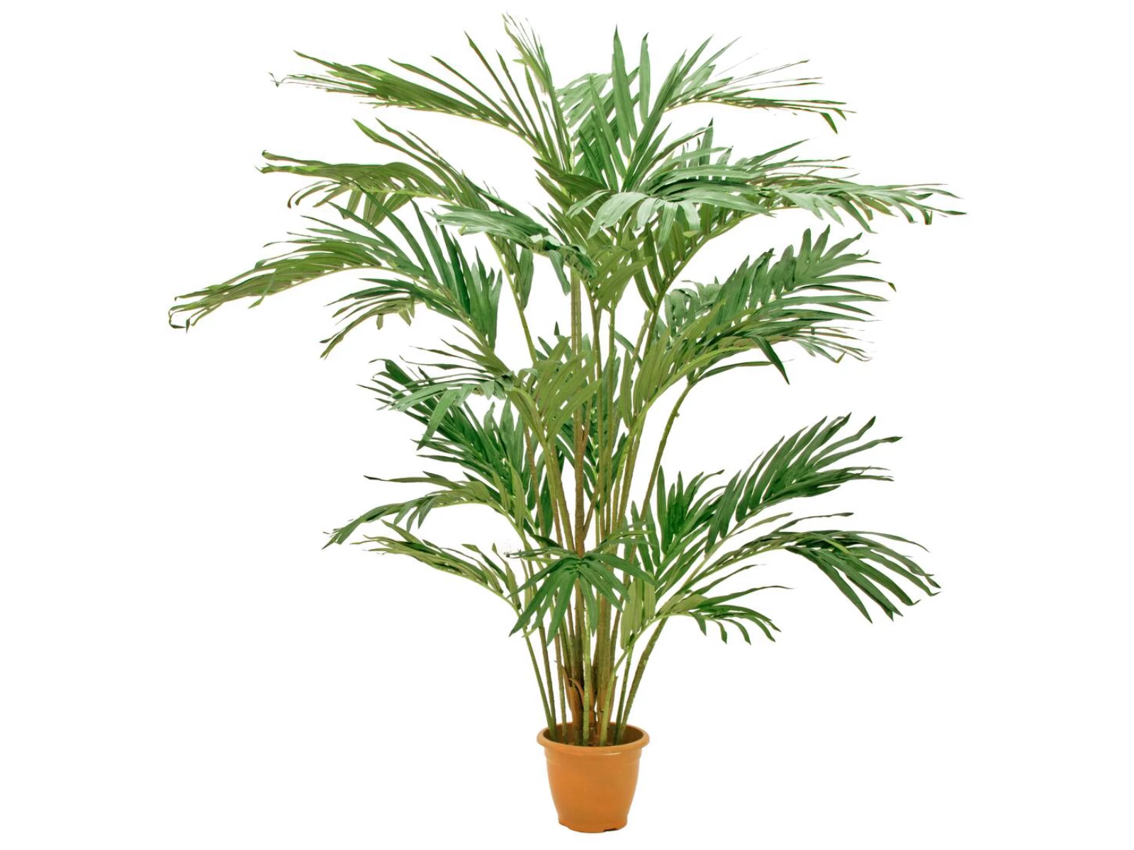 The beautifully shaped Canarian date palm by Europalms is already equipped with flame-retardant leaves when delivered from the factory. This makes it particularly suitable for use in places where DIN 4102/B1 fire protection regulations require it. These are, for example, public facilities such as public authorities, hospitals, retirement homes, but also event halls or exhibition stands.In addition, we recommend to freshen up the flame protection with a corresponding spray according to DIN 4102/B1 in regular intervals.The protruding leaves start already in the lower plant area and give the palm its luxuriant appearance.The artificial plant has a total height of approx. 240 cm and is firmly planted in a terracotta-look plastic pot for stabilization.