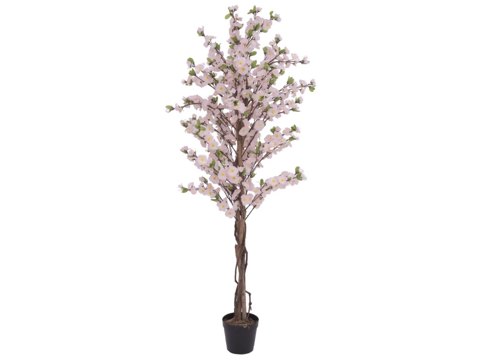 Spring awakening:With their beautiful blossoms, cherry trees are among the first harbingers of spring.The color palette of the graceful blossoms ranges from white to delicate pink to bright pink. Let the "Hanami" (ritual of looking at the cherry blossoms) take place in your premises with the detailed artificial plant from Europalms!Intertwined real stems with lianas form the trunk of the artificial plant and enhance the natural appearance. The branches of the tree crown are lush with pink textile flowers and the first, small, delicate green leaves peek out. Depending on the location and requirements, these can be bent into shape in a few simple steps (further apart = more voluminous).The included basic garden pot is covered with artificial moss and gives the plant a stable stand when setting in a planter.