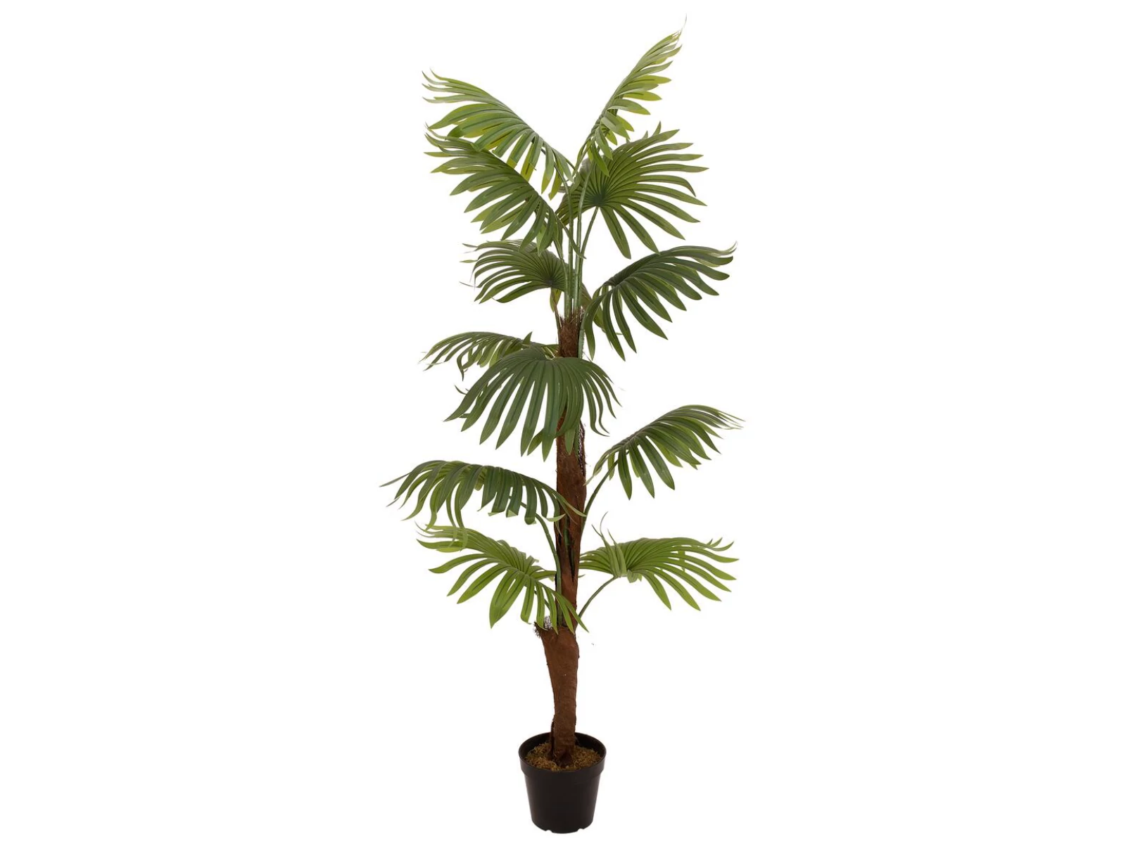 Artificial fan palms are perfect for Mediterranean palm decorations in wellness facilities, restaurants and cafes. But also at summer parties or in your own four walls they should not be missing as a summery, low-maintenance plant decoration. Especially in the implementation of the living trend URBAN JUNGLE they are a "must have".This detailed replica of a real fan palm impresses especially with its large, fan-shaped spreading ribbed leaves / fronds in different shades of green. These are made entirely of high-quality plastic and are therefore particularly durable. To achieve a lifelike appearance of the artificial plant, real palm fiber material was included in the processing of the trunk.Artificial moss serves as a cover for the basic gardener's pot included in the delivery. Thus, it can serve as a stand for a planter, as well as be used independently as a decorative pot.In order to unfold the full beauty of the artificial palm tree, its fronds only need to be slightly bent into shape.