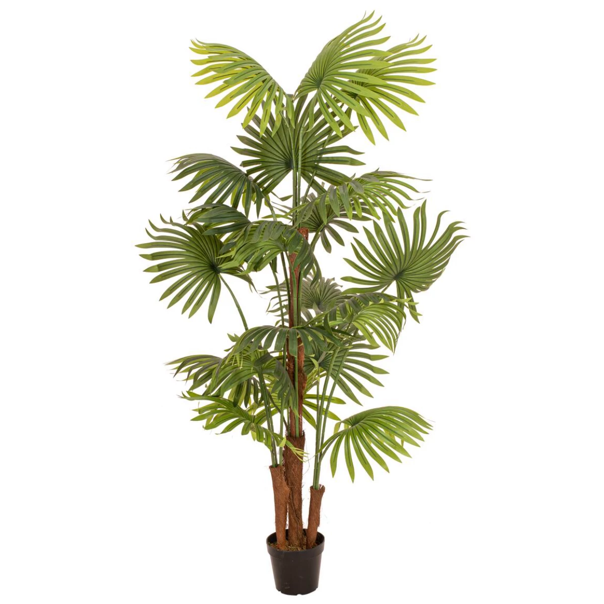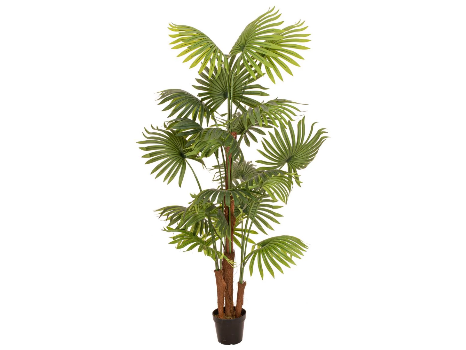 Artificial fan palms are perfect for Mediterranean palm decorations in wellness facilities, restaurants and cafes. But also at summer parties or in your own four walls they should not be missing as a summery, low-maintenance plant decoration. Especially in the implementation of the living trend URBAN JUNGLE they are a "must have".This detailed replica of a real fan palm impresses especially with its large, fan-shaped spreading ribbed leaves / fronds in different shades of green. These are made entirely of high-quality plastic and are therefore particularly durable. To achieve a lifelike appearance of the artificial plant, real palm fiber material was included in the processing of the trunk.Artificial moss serves as a cover for the basic gardener's pot included in the delivery. Thus, it can serve as a stand for a planter, as well as be used independently as a decorative pot.In order to unfold the full beauty of the artificial palm tree, its fronds only need to be slightly bent into shape.