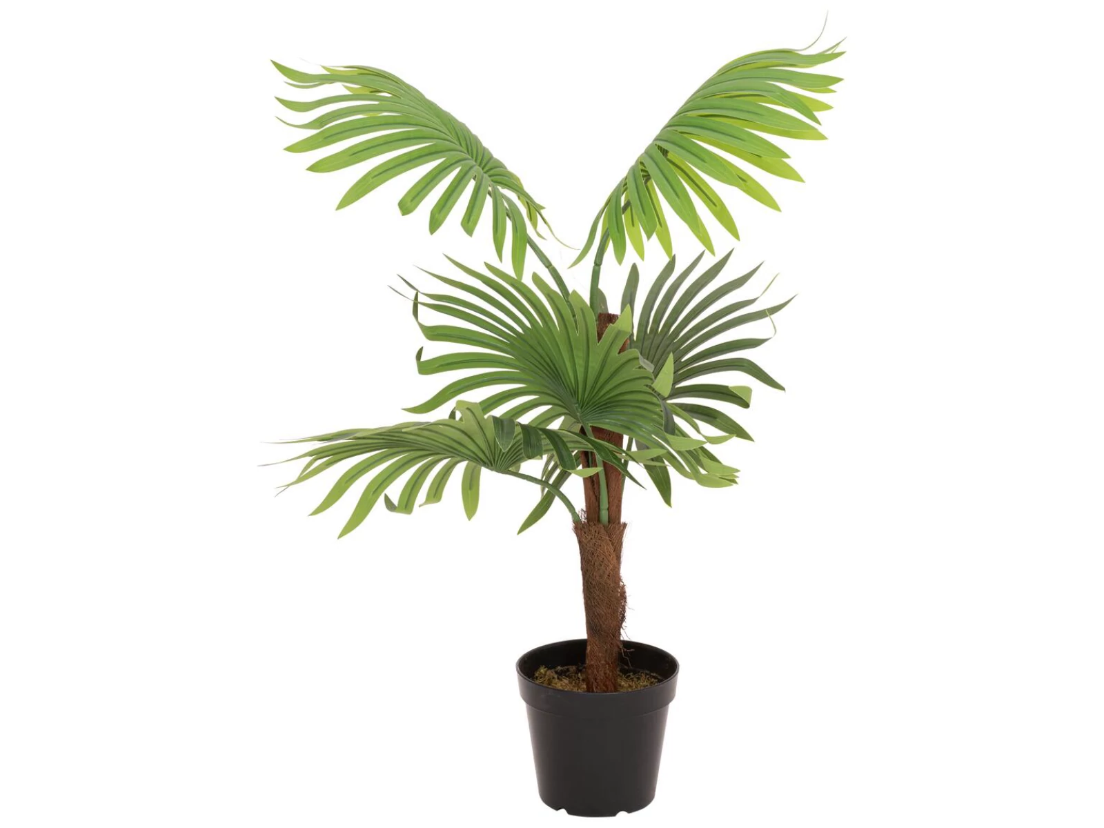 Artificial fan palms are perfect for Mediterranean palm decorations in wellness facilities, restaurants and cafes. But also at summer parties or in your own four walls they should not be missing as a summery, low-maintenance plant decoration. Especially in the implementation of the living trend URBAN JUNGLE they are a "must have".This detailed replica of a real fan palm impresses especially with its large, fan-shaped spreading ribbed leaves / fronds in different shades of green. These are made entirely of high-quality plastic and are therefore particularly durable. To achieve a lifelike appearance of the artificial plant, real palm fiber material was included in the processing of the trunk.Artificial moss serves as a cover for the basic gardener's pot included in the delivery. Thus, it can serve as a stand for a planter, as well as be used independently as a decorative pot.In order to unfold the full beauty of the artificial palm tree, its fronds only need to be slightly bent into shape.
