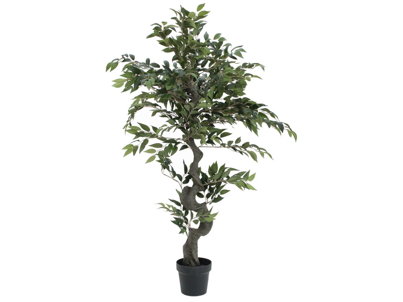 The birch fig, also called "Ficus Benjamina", is a popular indoor plant. Since the care of the natural model is not entirely unproblematic, Europalms offers a good alternative with the Ficus forest tree: The artificial tree will certainly not resent a change of location or difficult lighting conditions. Both its naturally structured crown and the small side shoots consist of numerous branches with pointed oval leaves made of textile. The curved trunk is made of plastic.The artificial ficus tree has a total height of approx. 110 cm and is supplied in a black gardener's pot, which gives the plant a stable stand when placed in a cachepot.