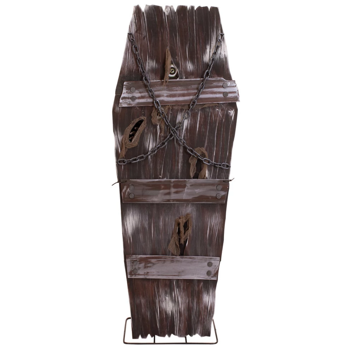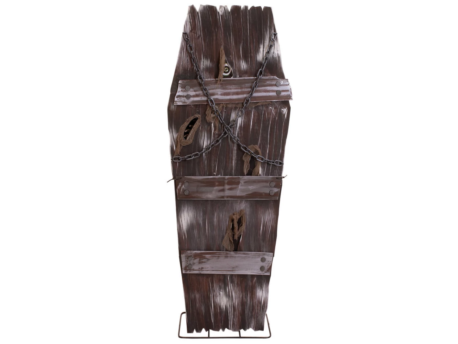 A macabre addition to any Halloween scene. Whether as an eye-catcher in the entrance area, as an eerie prop in a haunted house or as a gruesome shocker at a Halloween party: the "coffin of horror" will send chills down your spine and leave no one unimpressed.Creaking wood and eerie shadows - this coffin hides a dark secret. Once perhaps the final resting place of a criminal, it is now anything but silent. Its rotten boards are riddled with cracks and crevices, as if something had tried to break free from inside with unbridled force. However, two massive chains in the upper area seem to hold back the horror - but is the first impression deceptive? When the animation is activated, the coffin comes to life. A plaintive moan and cries emanate from its interior, while a bony hand reaches through one of the holes in the lid - groping, searching, ready to grab any unwary visitor. At the same time, two eyes peer out through further openings, dimly lit to ominous life.The animation of the Halloween decoration is activated by an integrated microphone or wired control.