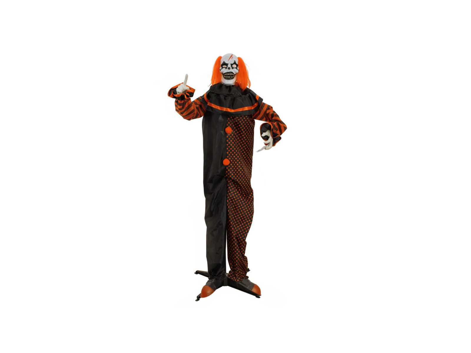 Clown or zombie, who is hiding here in the clown costume? With the pop-up figure from Europalms you get both. But WARNING: especially frightful people should beware of the double-headed clown!What at first glance looks like a stand-up figure of a horror clown soon turns out to be a scary zombie ready to give your Halloween or theme party guests a good scare. Due to a built-in mechanism, its head shoots up explosively after activation, revealing a creepy zombie head with glowing eyes. While the zombie head slowly lowers back into the clown's torso, screams and a haunted sound can be heard. The LED eyes of both horror heads also flash. In addition, the figure's arms can be individually bent into shape to welcome your guests to the circus of horror.The animation of the figure is activated via wired, manual control or the switch pad "Step here".