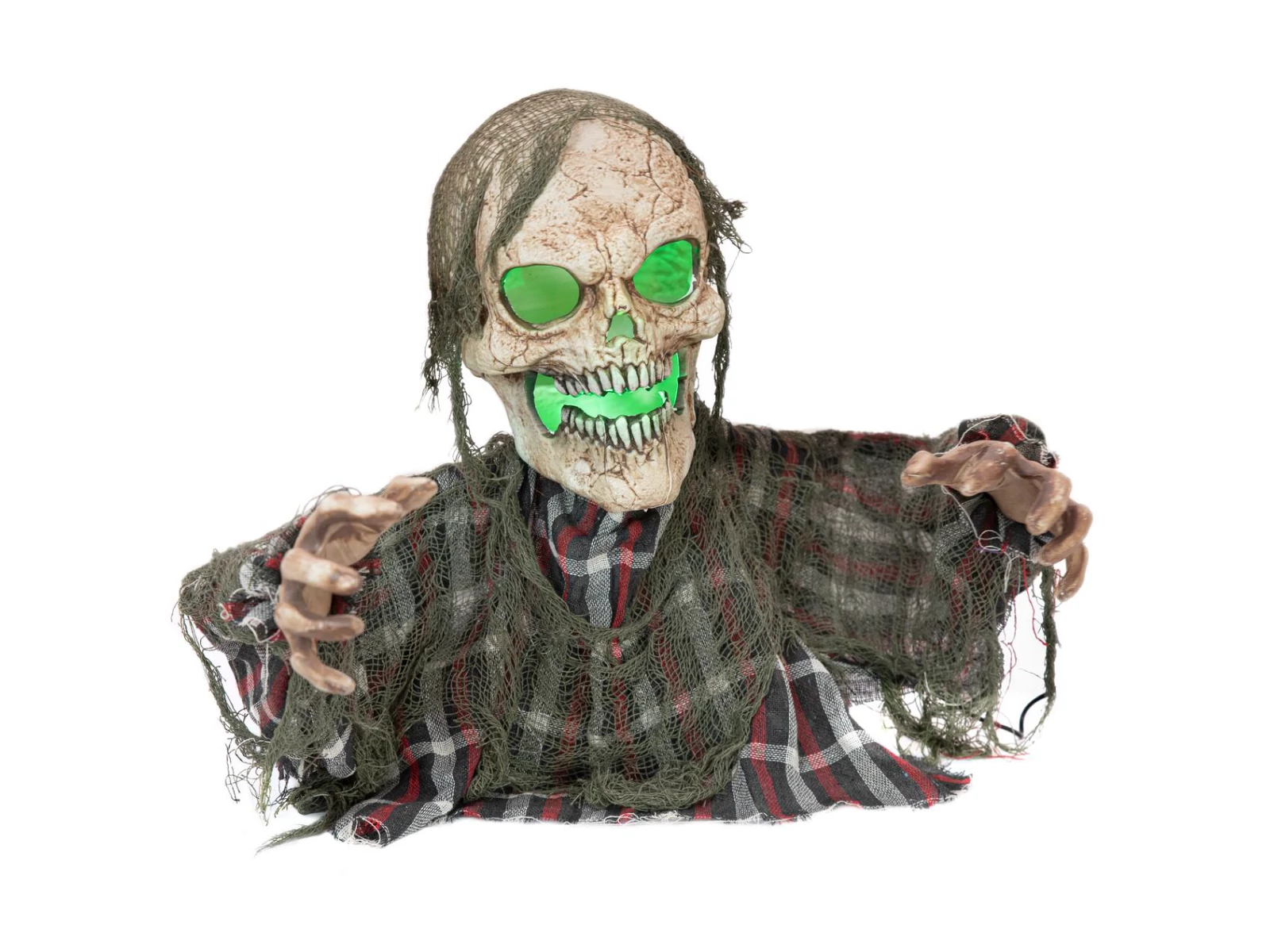 Whether placed on the floor or the buffet - the Groundbreaker skeleton should not be missing at any motto or Halloween party.The animated decoration bust from Europalms is dressed in a checkered shirt, over which a coarse-meshed fabric in olive green is laid. With loud groans and moans, the skeleton monster tries to get out of the ground. The rattling of heavy chains can be heard, with which it is apparently held. Desperately, it throws its head back and forth and tries to get a hold somewhere with its hands. Its hollow skull is mysteriously illuminated in green.The animation of the decorative figure can be activated via integrated microphone, via the switch pad "Step here" or with wired, manual control.The power supply of the bust can be via battery operation, USB-A cable for 5 V operation via power bank or power supply unit.