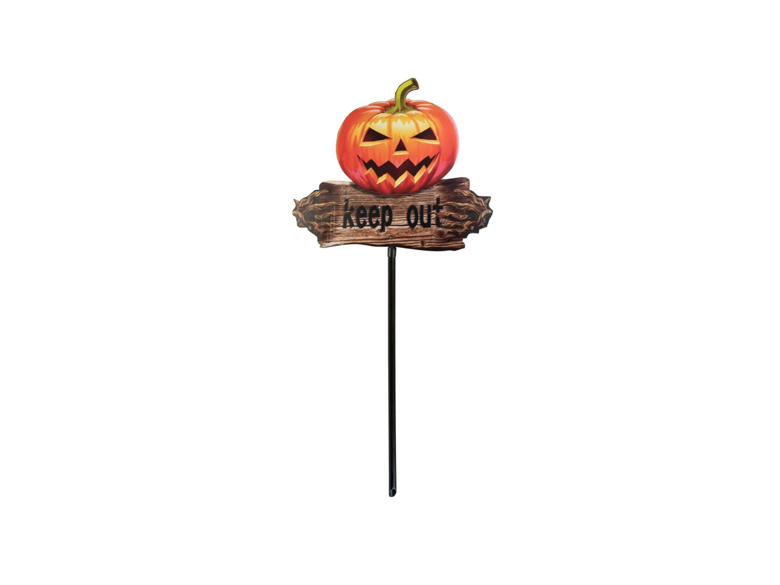 This pumpkin ground stake is the ideal Halloween decoration to warn all visitors of your theme party in advance: only the fearless should approach the prepared scary scenario and those who don't have strong nerves should rather stay away. The Halloween display is made entirely of plastic and features a carved pumpkin in bright orange and a piece of wood with the unmistakable message "keep out" burned into it. An included insertable stick can be used optionally and serves as a ground plug for a stable stand of the sign.