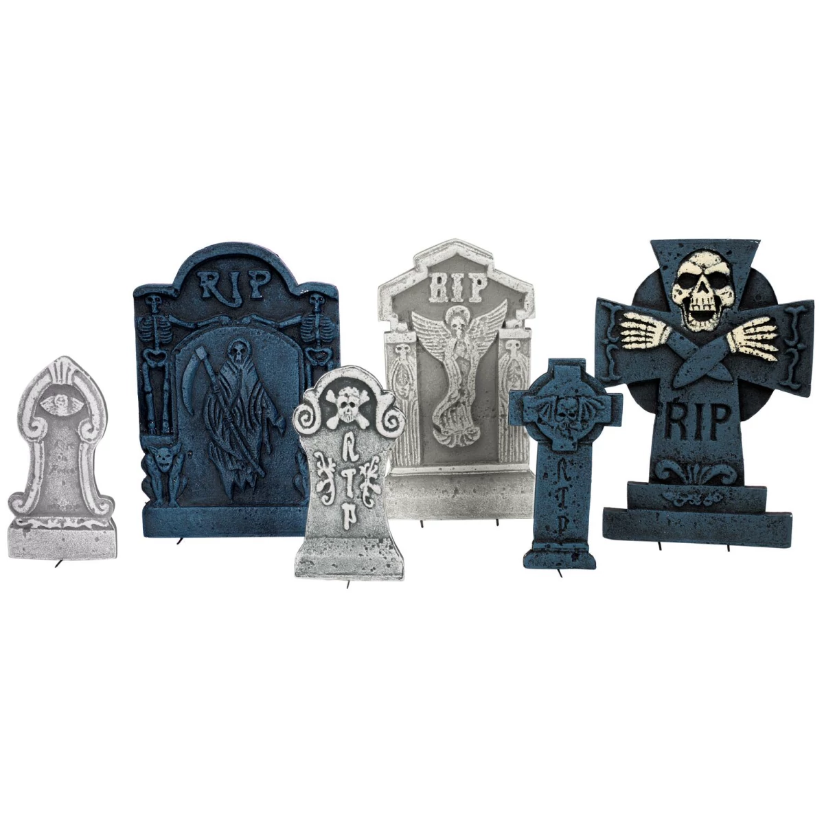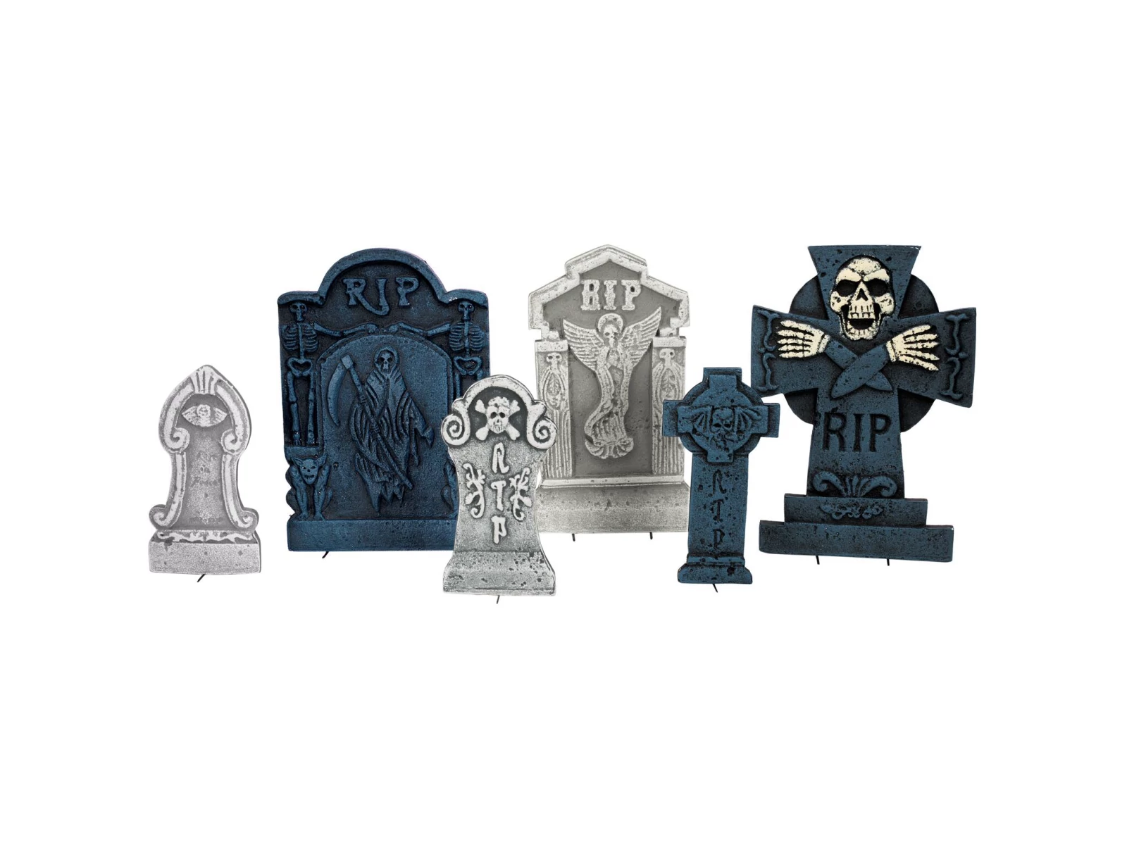The gravestone set from Europalms is the perfect addition to your Halloween decoration: Whether in your living rooms decorated with spider webs or placed outside.It consists of six Styrofoam gravestone pieces in different colors, shapes and sizes.Outside, the gravestones can be easily arranged - with the help of earth spikes - in lawns to form a cemetery. This can then be the basis of your spooky horror scene with spiders, spider webs, pumpkins and many other creepy creatures. Let your imagination run free!