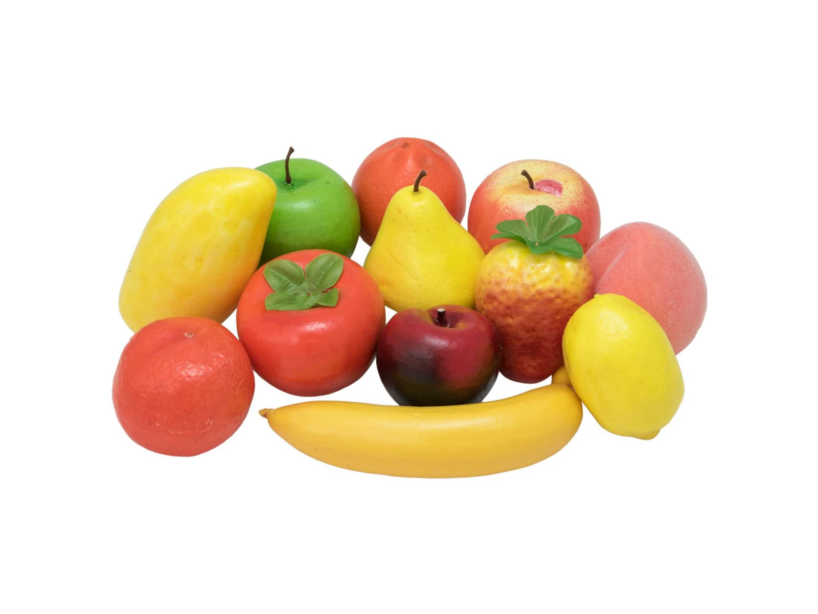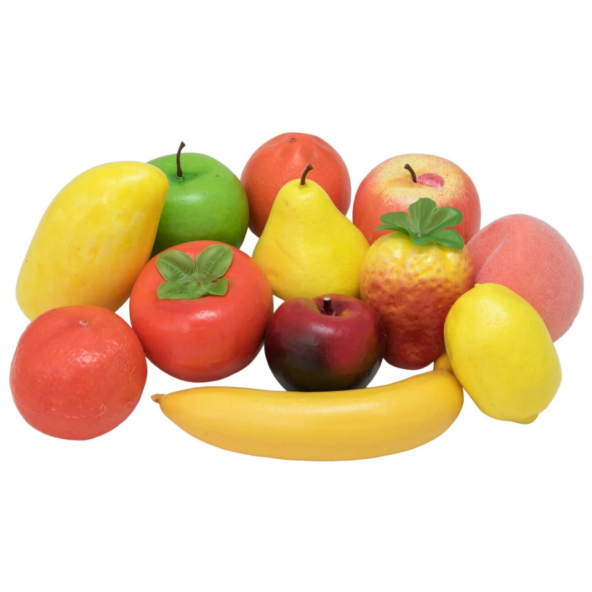 - 12 mixed plastic fruits in transparent bag.