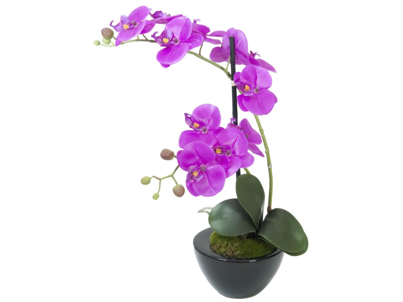 Orchids can be used to create targeted exotic color accents in living and business areas, especially when decorating windows and counters. One of the best-known representatives - the butterfly orchid - served as a natural model here:The arrangement consists of two flower stems of different lengths with purple flowers and flower buds. The flowers feel waxy to the touch, making it hard to tell the difference from the real plant. Leaves made of EVA material, aerial roots and a cover of artificial moss complete the lifelike appearance. Unlike its natural model, the artificial orchid will not resent any mistakes in care or location. Slightly bent, the artificial plant reaches a total height of about 45 cm.Your decoration ideas can be implemented in no time, because the noble black decorative pot is already included.