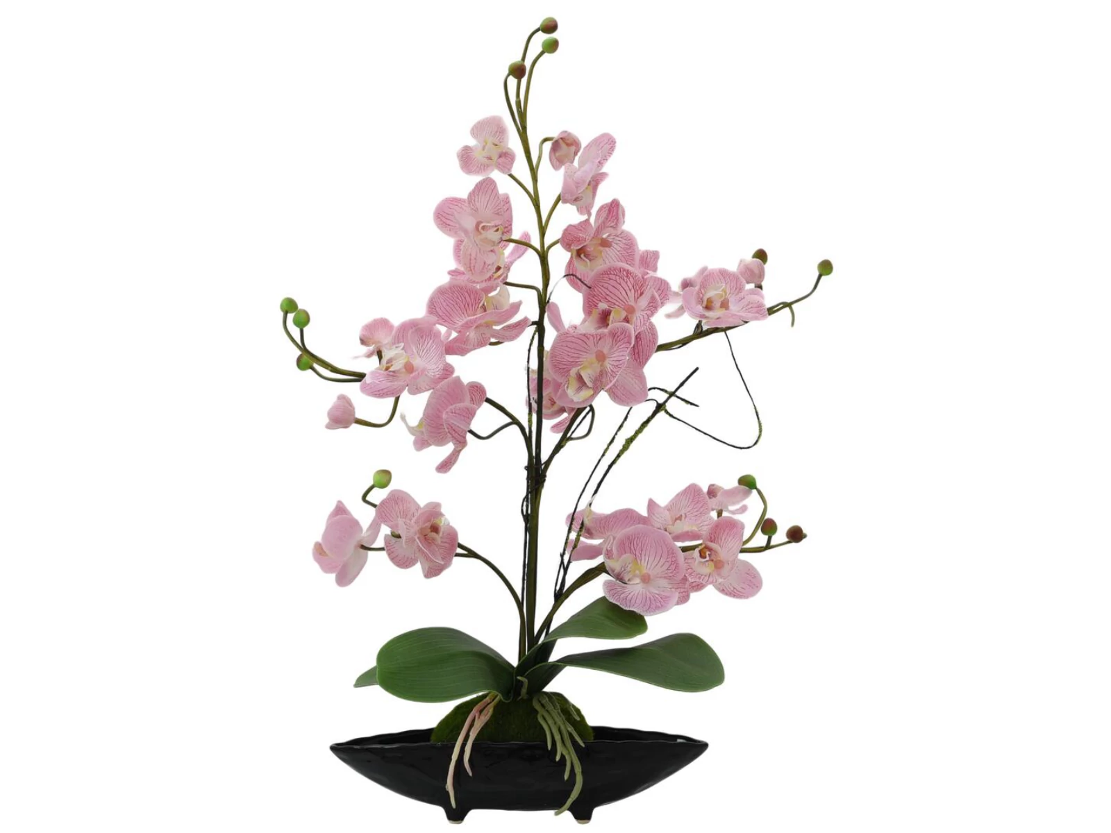 Timeless beauty and elegance are exuded by this artificial orchid arrangement from Europalms. It is particularly suitable for window and counter decorations in the home and business.The arrangement consists of a multi-branched butterfly orchid with graceful flowers whose petals show a play of colors from light pink to purple. Leaves made of EVA material complete the appearance. The exotic beauty was arranged on a moss hemisphere, above which its aerial roots lie loosely.The classy character of the artificial plant is enhanced by the included black ceramic planter.