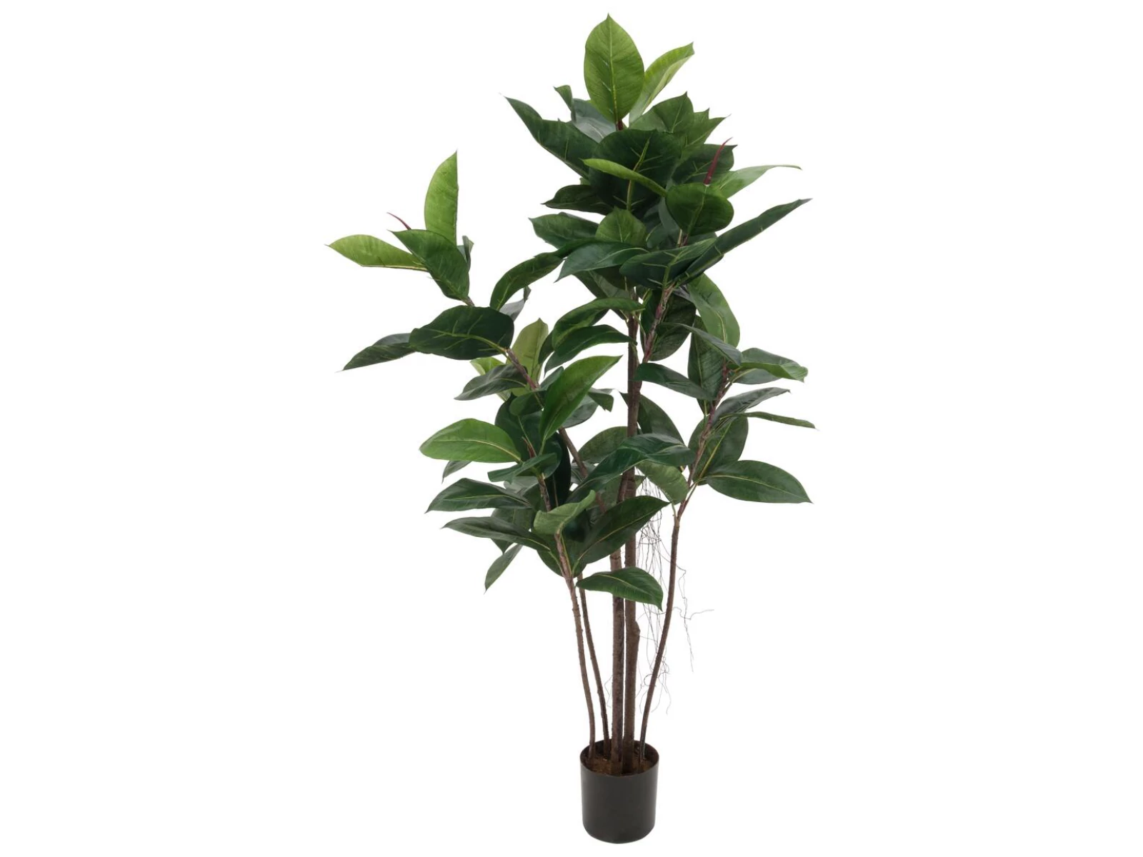 The rubber tree - botanically Ficus elastica - is experiencing its revival as an indoor plant: its elegant growth form combined with large, shiny, wide-oval leaves adds a tropical accent even to soberly furnished offices and living rooms.In contrast to the real rubber tree, this artificial alternative from Europalms does not resent difficult lighting conditions or draughts.During the production of the artificial plant, great importance was attached to natural details, such as the typical reddish petals, which protectively wrap the young leaves of the plant.The artificial rubber tree has a height of 120 cm and is delivered in a black gardeners´ pot, which supports the plant when put in a bigger decorative pot.