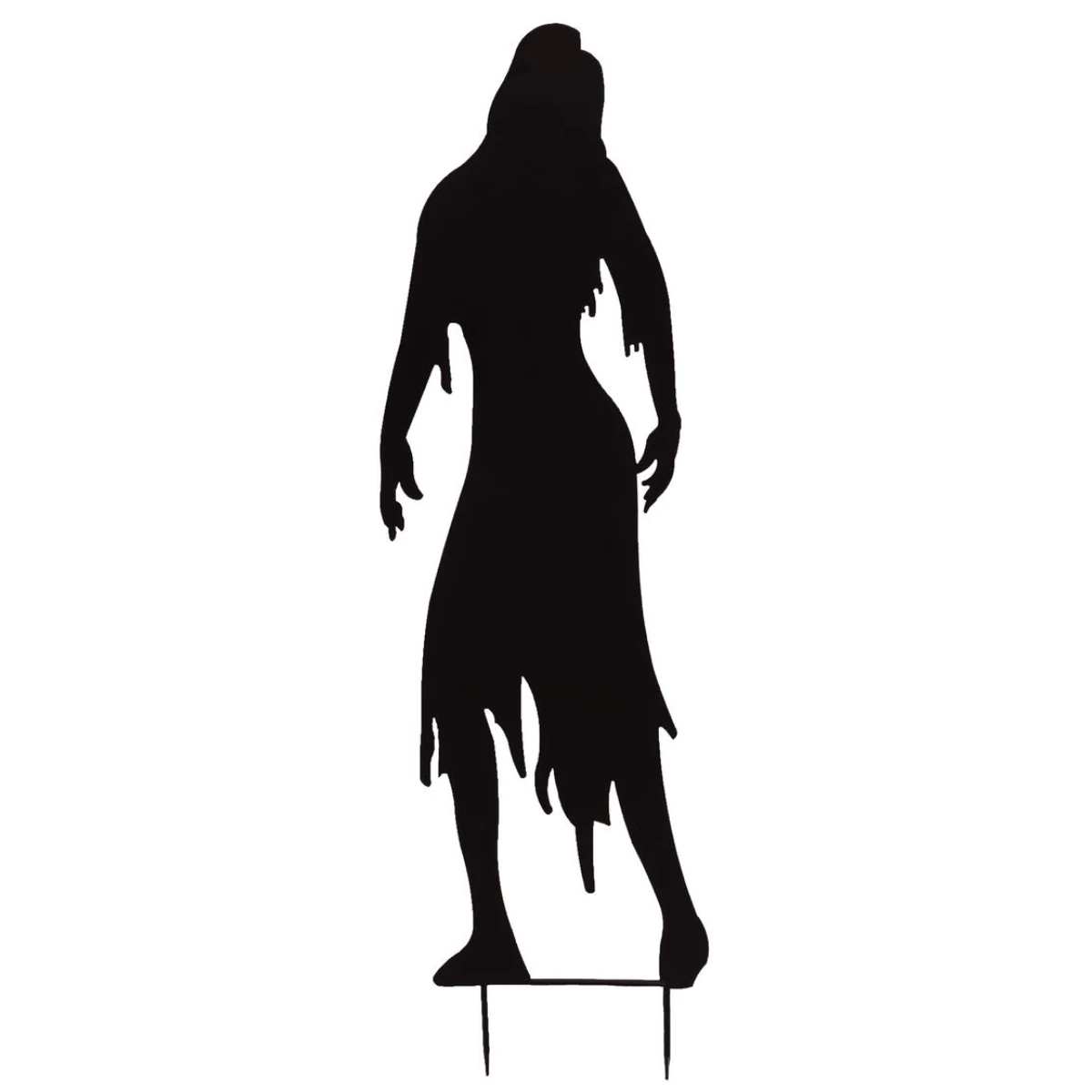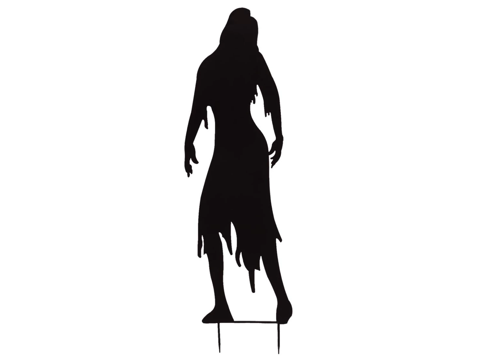 Are you planning a motto- or Halloween party and looking for a matching highlight for the appropriate scary atmosphere? With the metal silhouettes of Europalms you set accents or create a complete horror scenery that will inspire your guests.The 135 cm high silhouette represents a female zombie with shredded garments. Don't let the girlish figure fool you, the undead can attack your victims at any moment!Determine the scary factor yourself by increasing the scary effect with indirect lighting or the use of a fog machine.In the scope of supply are approx. 11 cm long earth skewers from metal contained, which can be screwed on with few handles. Thus nothing stands in the way of outdoor use in your garden or front garden.