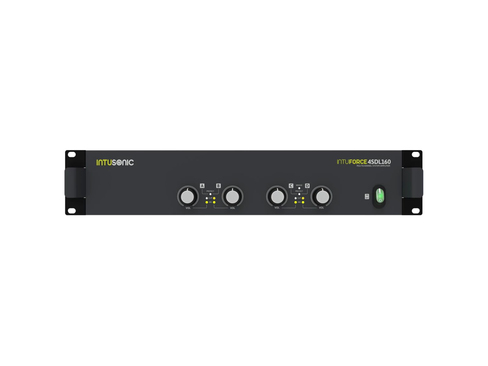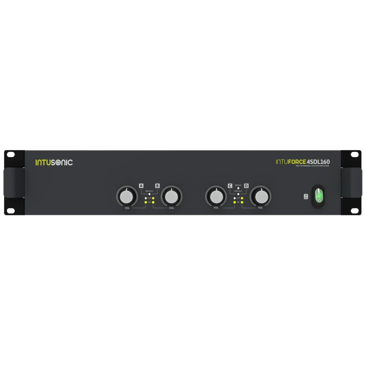 The INTUFORCE 4SDL160 is -- despite its simple front panel layout -- a highly versatile system amplifier for low-impedance sound systems. Via its comprehensive rear-panel controls, it can be set from a 4-zone amplifier to a dual stereo amplifier or a 2.1 satellite and subwoofer system amplifier. The latter is facilitated by its built-in active crossover with 4 selectable crossover frequencies and its bridging feature for the 3rd and 4th channel. Larger systems are easily set up via the link connectors. Built on cutting edge class D technology, the unit is convection cooled and hence suitable for applications sensitive to background noise. The conservative switch mode PSU design delivers not only peak power, but also long-term endurance. Best to be combined with 2 or 4 satellite speakers and a subwoofer as one compact system.