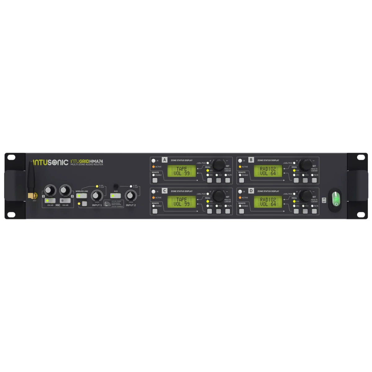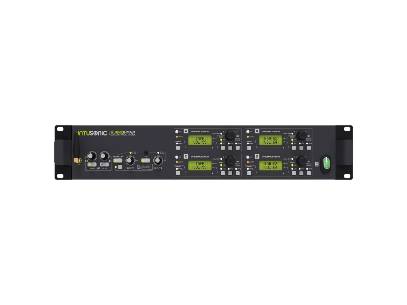 The INTUGRID HMA74 is a core unit for Intusonic's digitally controlled audio zoning, which is complemented by the HZE11 zone remote wall panel. Together they deliver a scalable audio routing system for background music. The HMA74 offers two microphone inputs, 5 line inputs, a front-panel 3.5mm TRS input and a LINKOUSTIC 4.2 wireless audio link, which can be flexibly routed to its 4 output zones, with each of these zones controllable either by the on-board user interface, the included IR remote or a wall remote control panel. Every zone can be configured extensively to meet the application's demands, while keeping user interaction extremely simple. The HZE11 zone remote wall panel allows to remotely control all zone settings plus accepts a local audio feed.