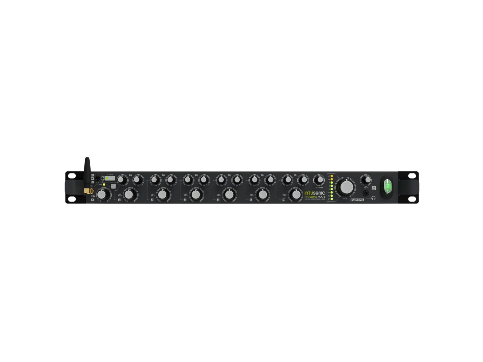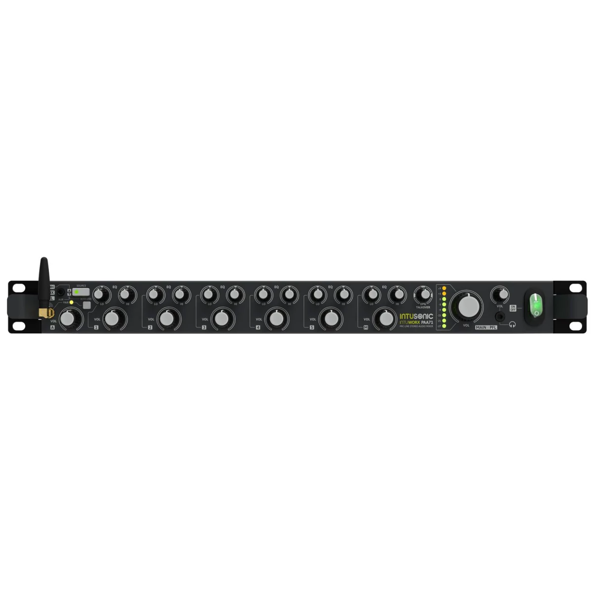 The INTUWORX PAA71 is a 7-channel mic/line mixer and the perfect center of any installed sound system. It offers 5 multi-purpose inputs which can either be fed with a balanced microphone signal or an unbalanced stereo line signal. One further balanced stereo line level input is specifically useful for sources at larger distance, like a mixer on a stage, or the output of a secondary room's system. The same input can be switched to receive its input signal from the 3.5mm TRS jack on the front, or the built-in LINKOUSTIC 4.2 wireless audio link. An additional dedicated microphone input with adjustable talkover (priority) provides control over announcements. Every input -- with the exception of the balanced stereo input -- is equipped with rear-panel gain control and a front-panel 2-band equalizer. The external shutdown and emergency signal input connections allow integration with central announcement and evacuation systems where required.