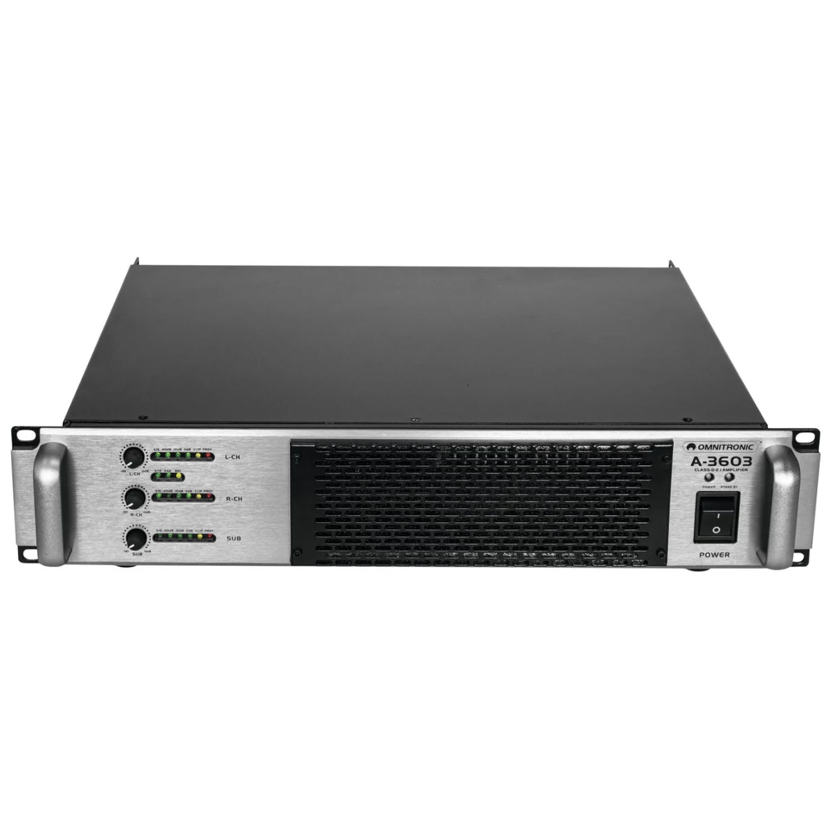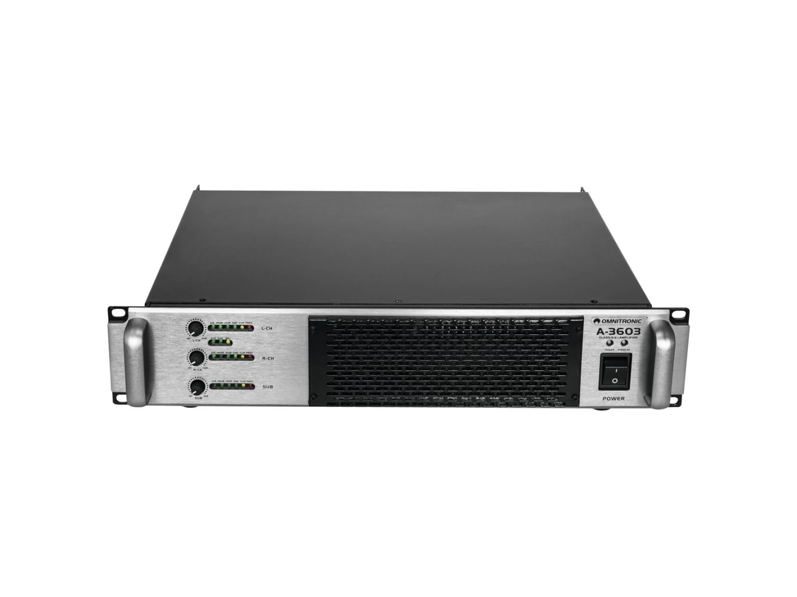 Powerful 3-channel amplifier - for classic 2.1 applications with two top and one sub speakerThe A-3603 produces enough power to supply large speaker system with up to a maximum of 3600 watts, 4 ohms (2000 W sub and 2 x 800 W tops). Enough potential you can use in clubs, lounges, restaurants, dancing schools and fitness studios and the like.Set the frequency between the tops and subs with the inbuilt crossover. It also features a bypass function, which enables you to connect ahead a DSP speaker management system. You can as well switch from 2 stereo input channels to 3 separate channels. Save weight when you have to move it and save space when you mount it - the Class D construction and the switching power supply technology help you to do so.