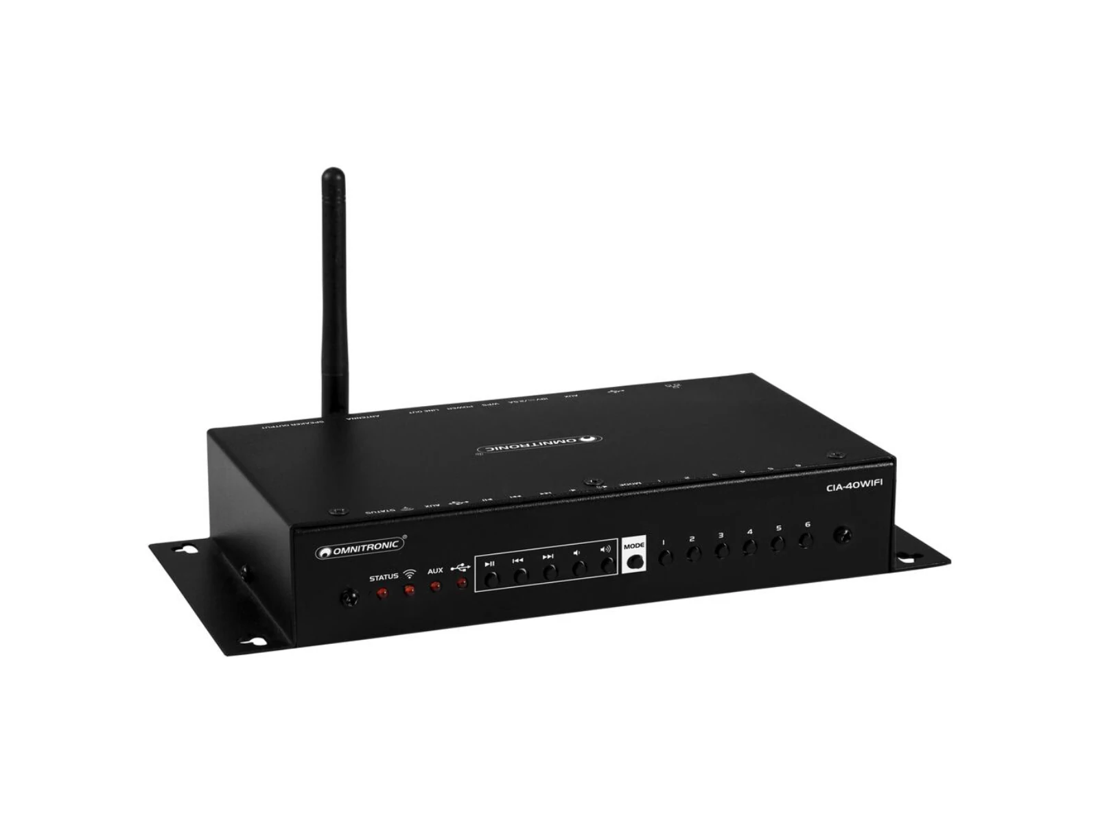 Streams and amplifies your favorite music around your homeThe CIA-40WIFI is Omnitronic's new streaming wonder. The wireless multi-room system streams cloud music from your favorite services, such as, Spotify, Tidal, Napster and TuneIn, to speakers you already own. Connect multiple devices in different rooms and enjoy your favorite music throughout the house. Control everything directly from your smartphone and tablet with the free 4STREAM app for iOS and Android.The CIA-40WIFI complies with the DLNA standard and also streams Amazon Music, Apple Music, YouTube and other music sources via AirPlay. You can even connect your analog audio devices such as turntables, stereos or MP3 players and stream this sound through the multi-room feature. A USB port allows direct connection to flash drives or other storage devices. The CIA-40WIFI gives you the ultimate flexibility in streaming your audio sources.The integrated 2 x 25-watt class D amplifier delivers perfect hi-fi sound for your speakers. Whether they are floorstanding, in-wall or ceiling speakers - the CIA-40WIFI is capable of powering any low-impedance loudspeaker type. Active speakers are also compatible and can be connected via the line output.Use the control buttons to directly control your music selection, volume, and playback. Especially handy for Internet radio: 6 station memories for your favorite stations. The CIA-40WIFI starts automatically with the last selected music source. This means that the last played album, playlist or radio station is simply resumed without you having to do anything.The CIA-40WIFI can be integrated into your network within seconds using WPS technology. It also provides an Ethernet jack for a wired network connection. The robust metal housing has mounting strips for simplified wall mounting and measures 14 x 22 x 11 cm. Delivery includes an English operating manual, the power supply unit and a WiFi antenna.