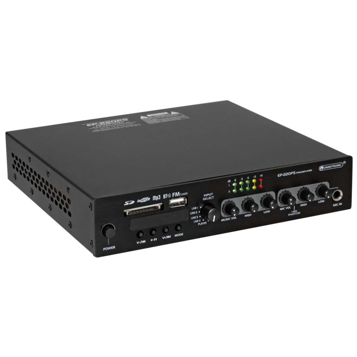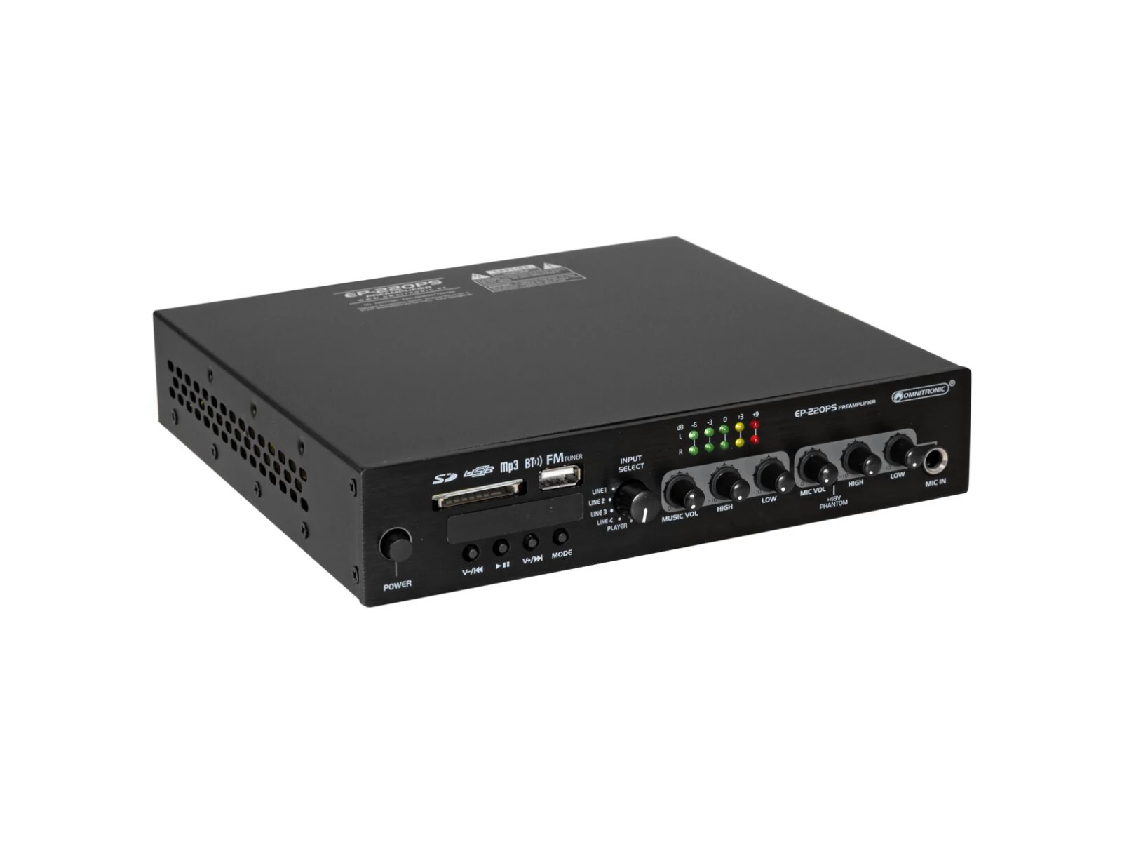 The EP-220PS is particularly suitable for permanent installations in restaurants, gyms and retail locations which require quick-access music playback control. It features 2-way tone control and offers four inputs for audio units with line signal level (e.g. CD player, tuner, mixer). Stream your music wirelessly from your smartphone, tablet or computer via Bluetooth to the built-in audio player, which also offers an FM tuner and slots for USB storage devices and SD(HC) memory cards. A remote control is included for convenient control of the audio player. Via the input selector one of the sources can be selected for playback. The preamplifier is also provided with an adjustable microphone input. For better intelligibility of an announcement, a priority function can be activated. Thanks to its separate master outputs the EP-220PS can be directly connected to active speakers or amplifiers.
