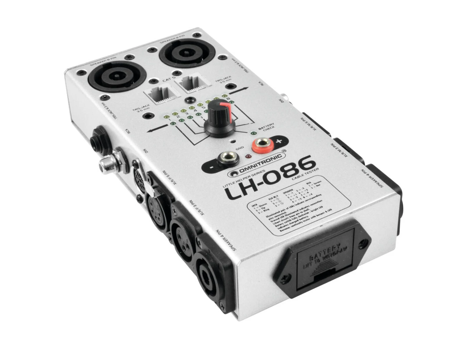 The OMNITRONIC LH-086 controls the function of 3 and 5-pin XLR-, 3.5/6.3 mm jack (also stereo), CAT5, DIN, RCA and 4 and 8-pin speaker cables and connections. A polarity and short-circuit display enables an easy control. Testing the continuity via two banana sockets is possible as well.