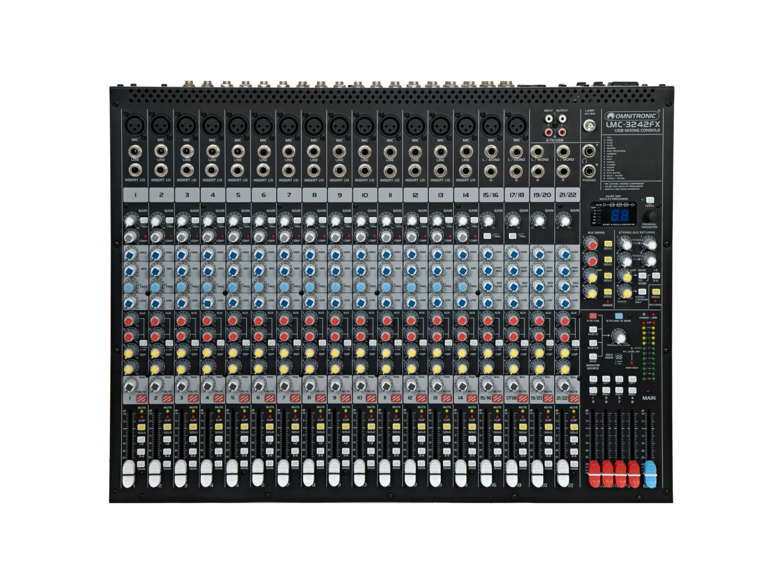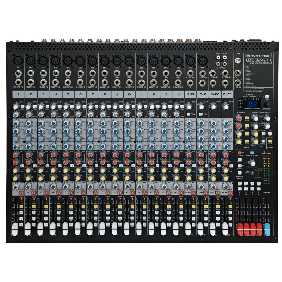 Professional live mixing consoles with British EQ, FX unit and USB interfaceEffortlessly achieve the right sound with the LMC series by OMNITRONIC! The incredibly user-friendly mixing consoles provide a warm, natural sound with outstanding audio parameters, an extensive set of features and maximum reliability - ideal for professional studio recordings, live performances, and fixed PA installations. Especially the 2022FX has several useful features that are unparalleled in this price range: feedback detection system, voice canceller, and 3D stereo surround effect.All mono channels feature extremely low-noise, top-notch microphone preamps that offer an extraordinary 130 dB of dynamic range, and a bandwidth ranging from below 10 Hz to over 200 kHz for crystal-clear signal reproduction. The incredibly warm and natural equalizers used for all channel strips are based on classic "British EQ" circuitry from mixing consoles of the '60s and '70s. Additionally, your LMC series mixing console has a studio-grade compressor with easy one-knob functionality on each mono channel plus a 24-bit FX processor with 16 editable effects which can be added to individual channels, busses or the main mix. Utilizing the built-in USB audio interface with up to 48 kHz sample rate, you can link your Windows or Mac computer and record your sessions instantly.