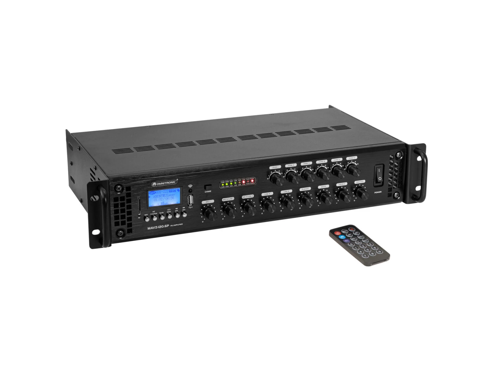 6-zone-PA mixing amplifier with audio player and remote control, adjustable zones, 120 W RMS