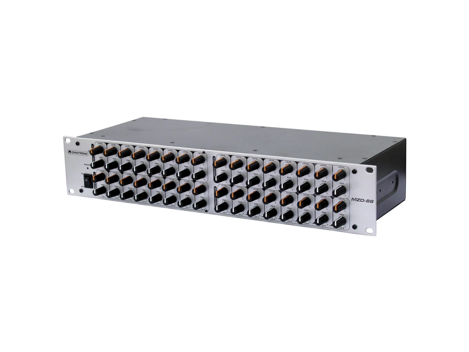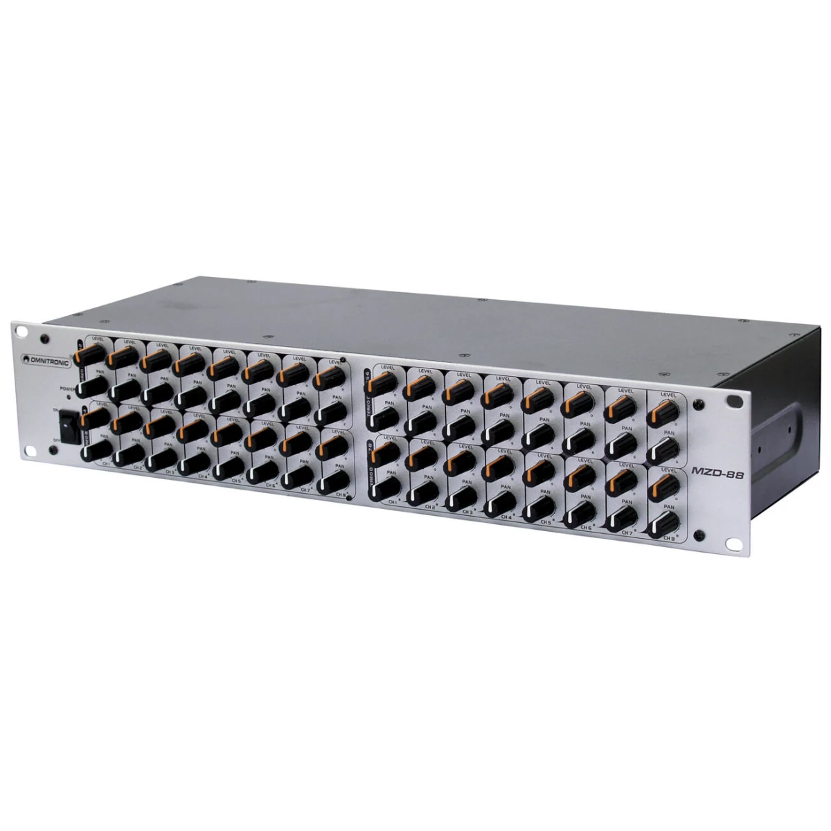 The OMNITRONIC MZD-88 is an audio mixer with an analog matrix of 8 input and 8 outputs which allows for multiple output configurations and inputs mixing. The 8 outputs are divided in 4 groups. Thus it's possible to supply 4 different PA zones with a stereo output by routing different input signals to these zones without having to change the cable configuration. It's also possible to obtain 8 outputs with different mixing as every input has its own level and PAN controls. Perfect for any place where multi-zone or multi-room solutions are required, just like in theme parks, conference centers, schools or as the case may be. By the way, the MZD-88 could also be used for personal monitoring.