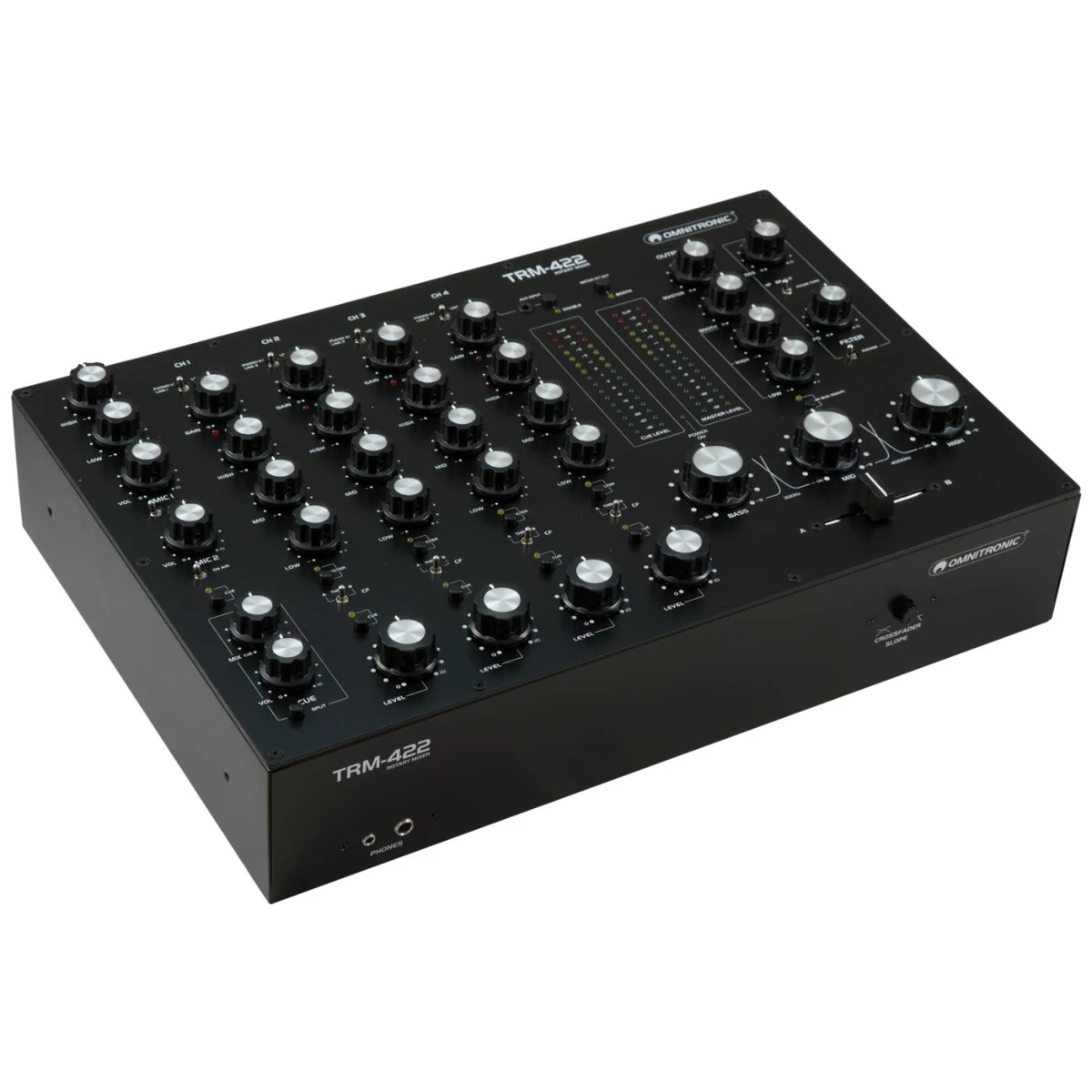 - 16-digit stereo LED level meter, switchable between master and booth outputs