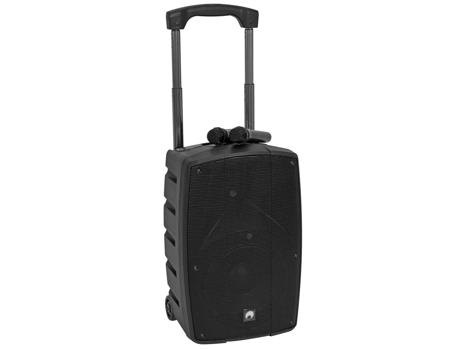 Mobile 12" PA system with battery operation, audio player, Bluetooth and 2 wireless microphones