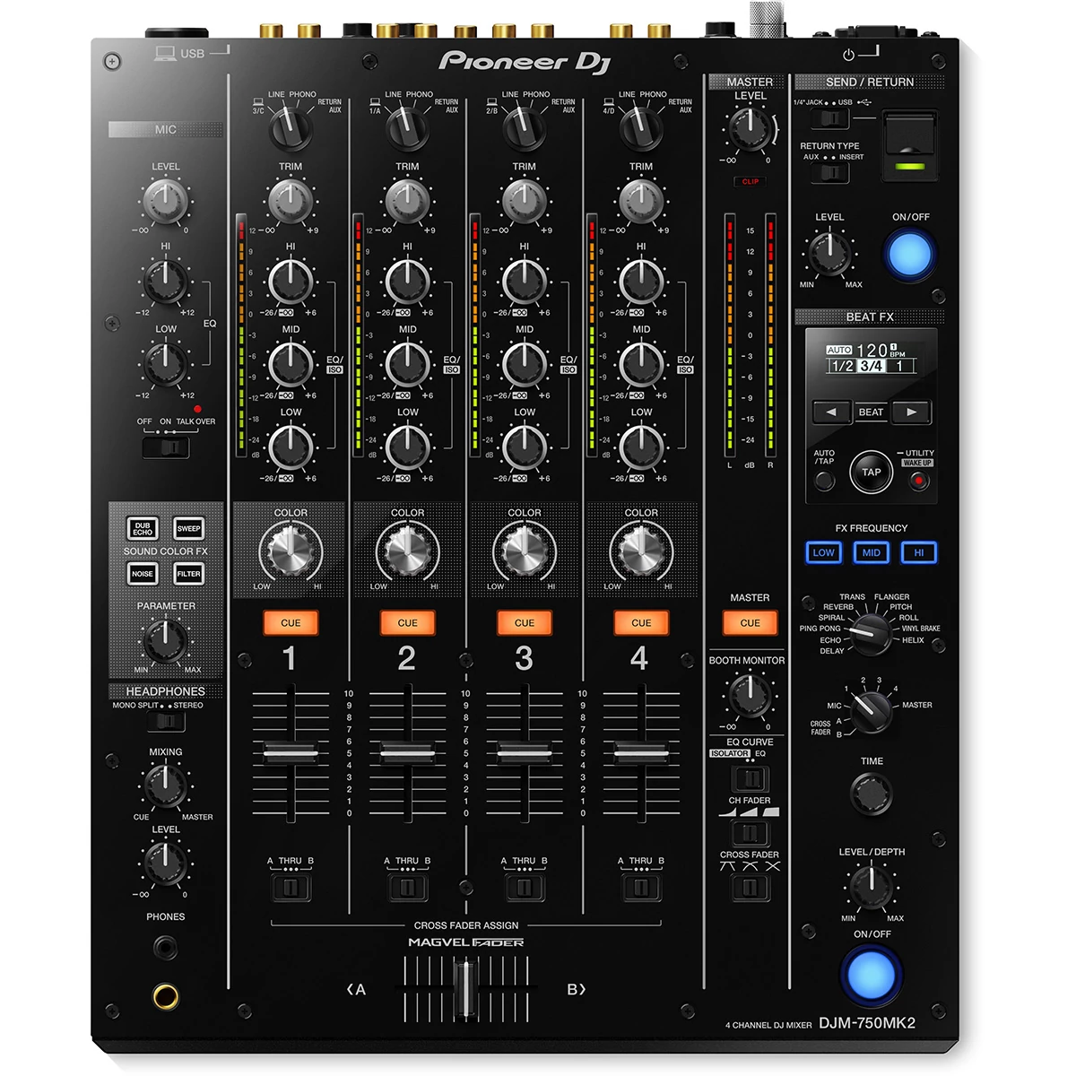 A Pioneer - DJM-750MK2, egy professzionális 4-csatornás keverő, örökölte a Pioneer - DJM-900NXS2 legfontosabb jellemzőit és designelemeit. CDJ vagy XDJ eszközökkel bármely nagyobb klubban is megállja a helyét. A DJM-750MK2-ben az EQ-k és a csatornafaderek sima görbéinek köszönhetően pontos, precíz keverést biztosít . A DJM-900NXS2-ből örökölt A Pioneer által kifejlesztett Magvel crossfader a piac legprecízebb crossfader technológiája. Biztos érzés és azonnali válaszidő a legbonyolultabb Scratch technikák során.