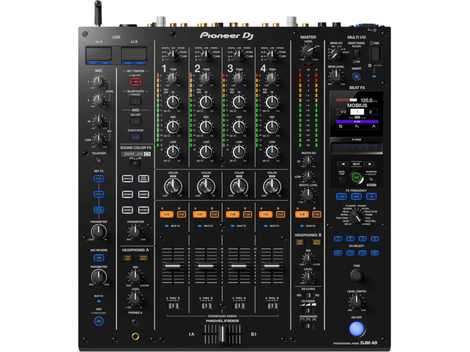 A Beat FX ösztönösebben használható a DJM-A9-en az új színes kijelzőnek és a megújult X-Pad-nek köszönhetően, amely immár vízszintesen elrendezésű, így oldalra húzással egyszerűbb lett a használata. A Beat FX csatornaválasztás mostantól dedikált gombokkal történik, amelyek gyorsabb kiválasztást eredményeznek. Az effekt Multi I/O szekciót pedig továbbfejlesztették, hogy valódi SEND lehetőséget kínáljon. Összesen 14 Beat FX közül választhatsz, köztük 3 teljesen új.