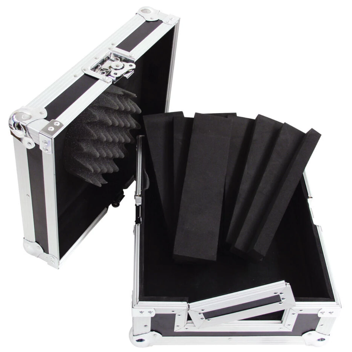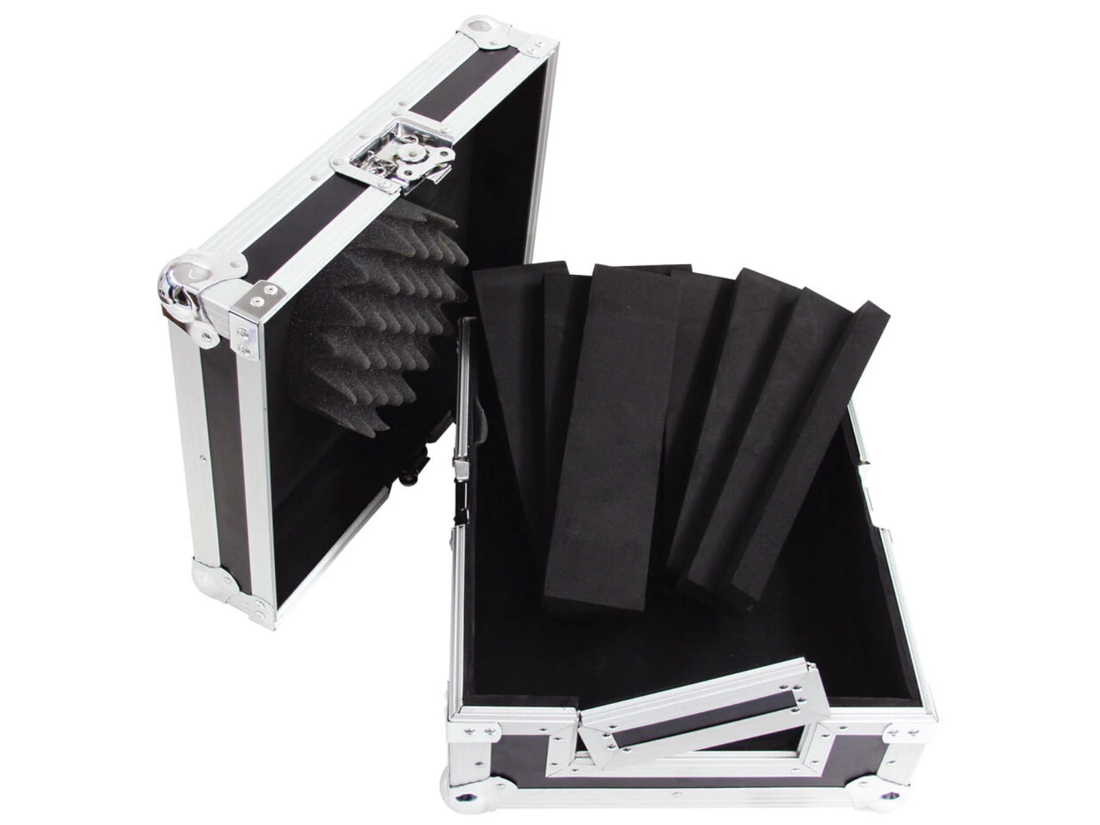 DJ flightcase for tabletop DJ CD playersThe ROADINGER CD player carrying case is especially suitable for DJs who want their tabletop CD player always safely stored. The carrying case has a removable lid and a removable front panel for CD players with front slot.The foam padded interior, the aluminium profile frame with rounded corners and the three-legged, medium-sized steel ball corners provide the necessary stability. In addition, the flight case is equipped with two high-quality butterfly locks and padded handles.The optional adapter strips for fitting CD players are included in the package.